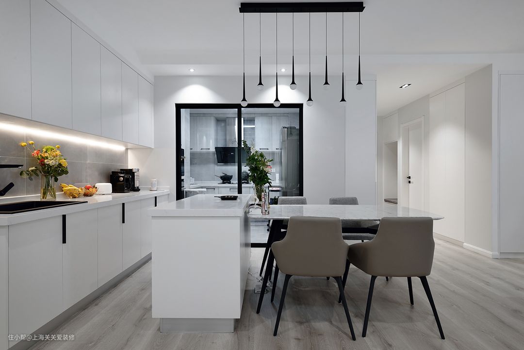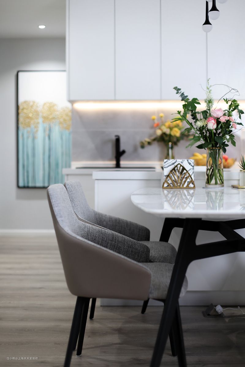 经过这番设计以后,动线更加合理,现在使用起来更符合业主日常生活 搭配上定制的中岛吧台,让整个餐厅的功能性得到了完整的体现。