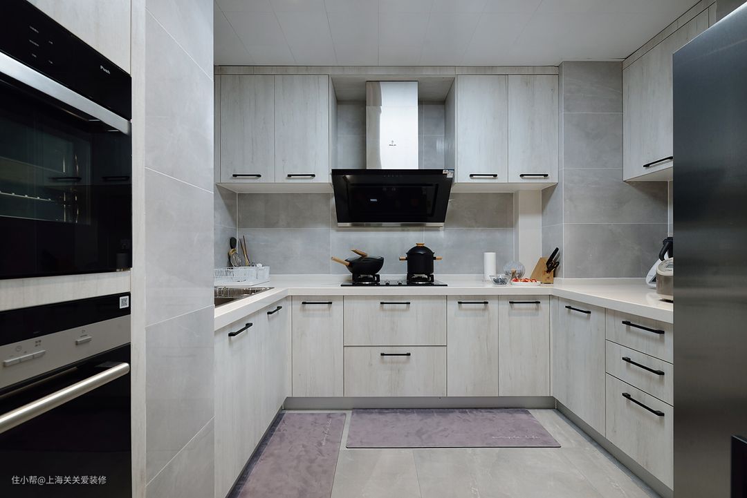 原本的厨房是L型的橱柜,利用率不高,原有的餐厅区域也被一排很宽的柜子占用,空间设计不合理,通过改造把厨房墙体往餐厅区域外移,增加厨房空间同时设计改造成U型的橱柜。