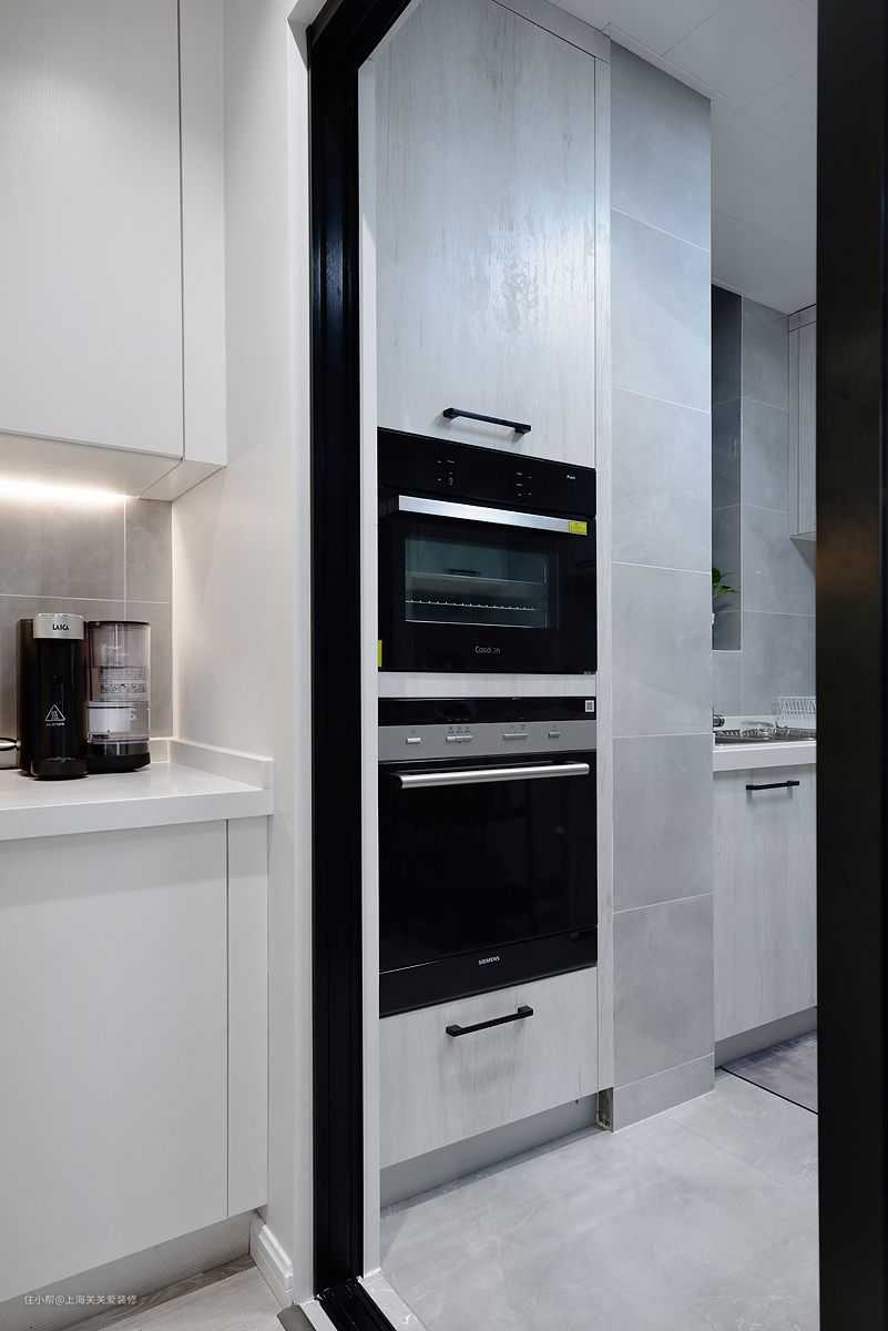 利用外移墙体与管道之间的空间内嵌了一个电器柜,可以安装内嵌蒸箱以及烤箱。其次餐厅增加了西厨区域,配备上下柜以及台面。加装了水池让使用更加便捷 整体的储物空间和原来相比丝毫没有减少。