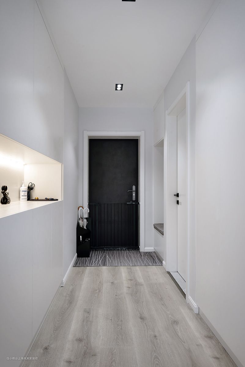 本案在进门区域原本的厨房门是这里,所以从餐厅进出厨房特别不方便,而且厨房操作空间也不大,所以我在设计中,将原本的厨房开门封掉,墙体相应往厨房内移,内嵌一整排与墙面齐平的鞋柜,厨房门用两扇落地玻璃的形式开在面向餐厅的一侧,保持门厅动线的完整性且增加了进门处的储物空间。