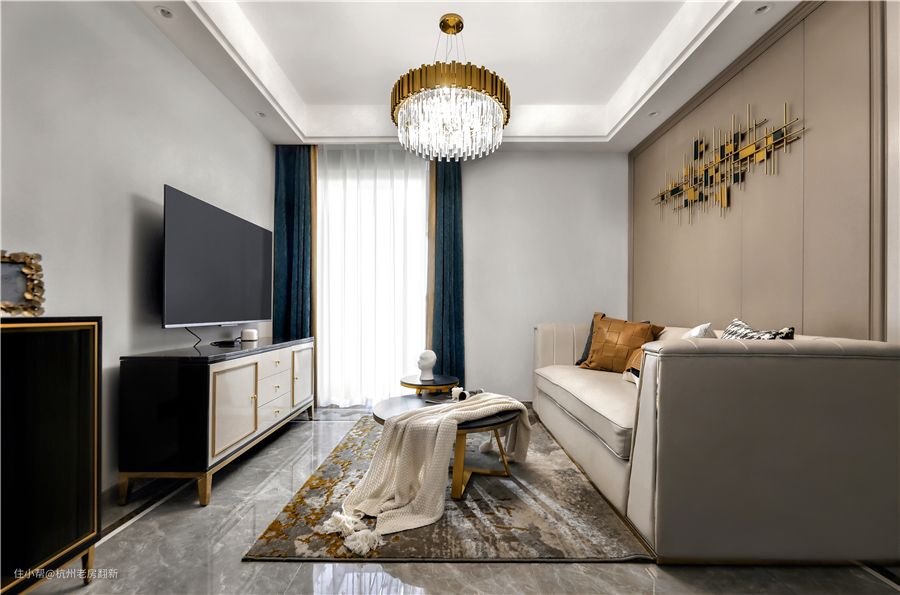 吊灯、茶几、沙发走边和墙上的装饰物都融入了金属元素,再搭配软装,可以提升空间的品质感。蓝色和黄色拼接的窗帘,意外的好看,搭配在客厅非常的清新。