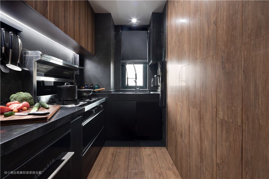根据厨房的空间结构设计成L型,整面的原木板加上经典黑的岩板桌面,让空间彰显优雅的格调。
