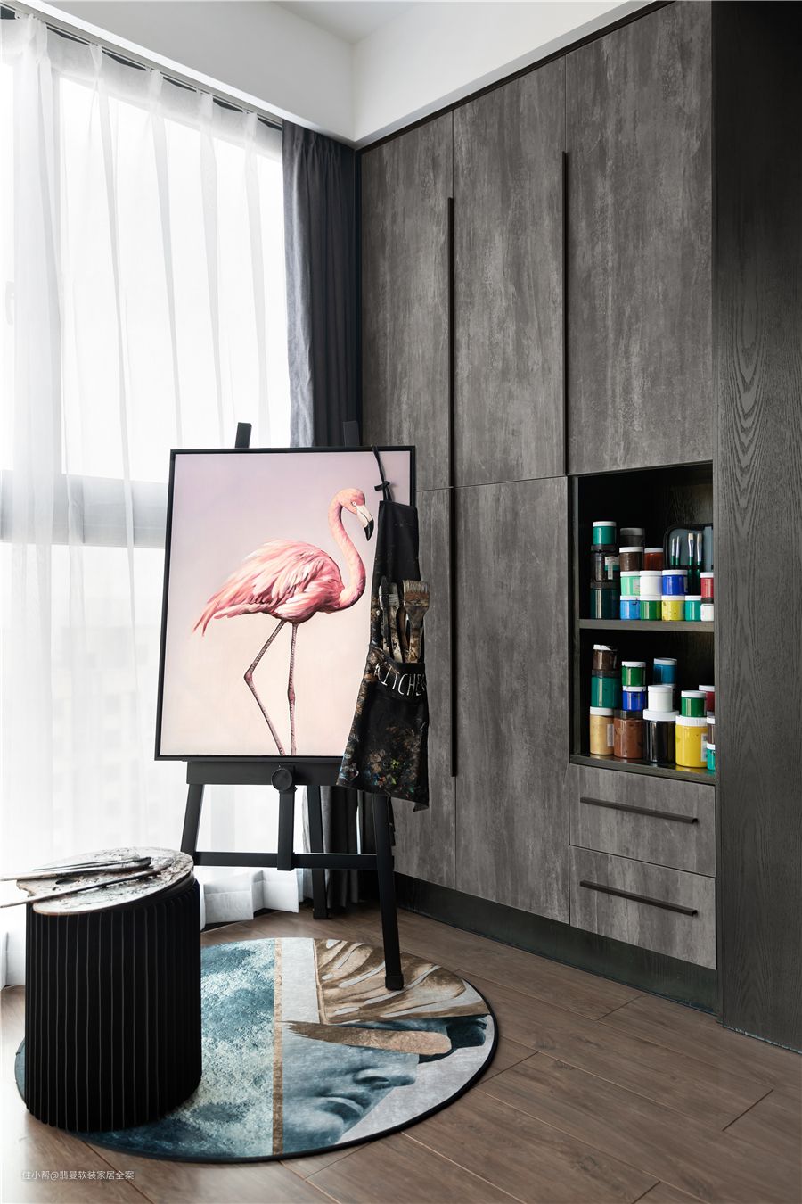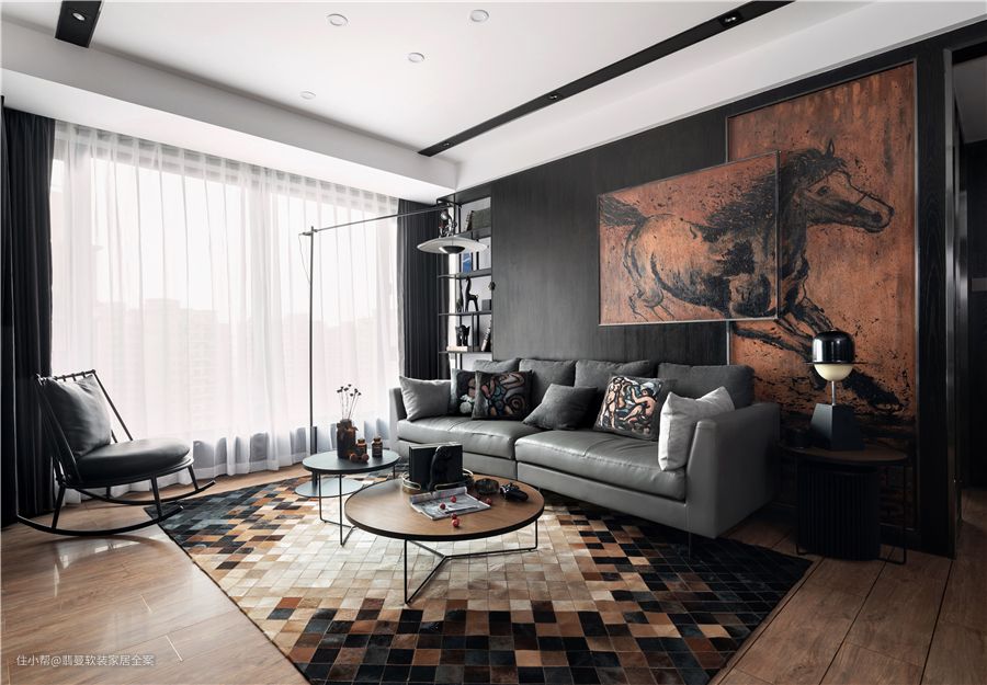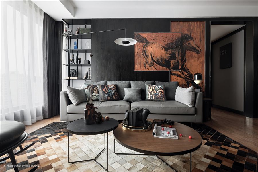 问:本屋的设计理念是什么? 答:以人为本为中心,创造功能合理、舒适优美、满足人们物质和精神生活需要的室内环境! 造型和配色上,我要满足客户希望自己家的比较硬朗、简洁、不过时的要求 格局上,我要满足客户希望朝南两个房间舒适敞开以及需要一个独立的办公空间的要求 问:最满意的设计亮点是什么? 答:黑色的露纹面板+胡桃木的门板+黑色不锈钢,客厅沙发背后的墙绘也是设计师画了一个多月的创作,
