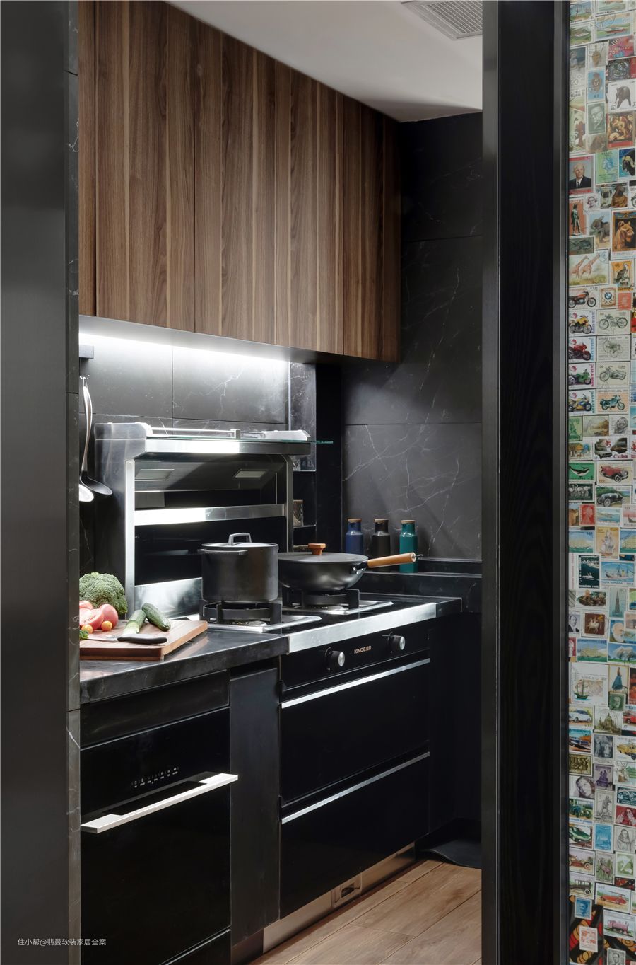 背景墙面黑色的乳胶漆,黑色的木材、胡桃木的门板、黑色不锈钢,搭配橙黄色的色彩,不同材料之间的巧妙结合,形成舒适的观感。