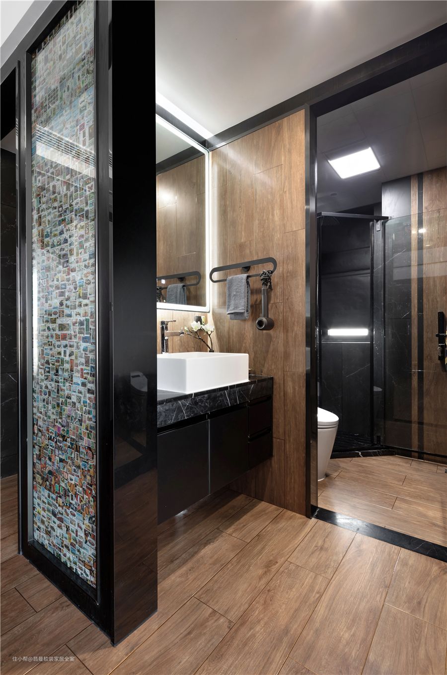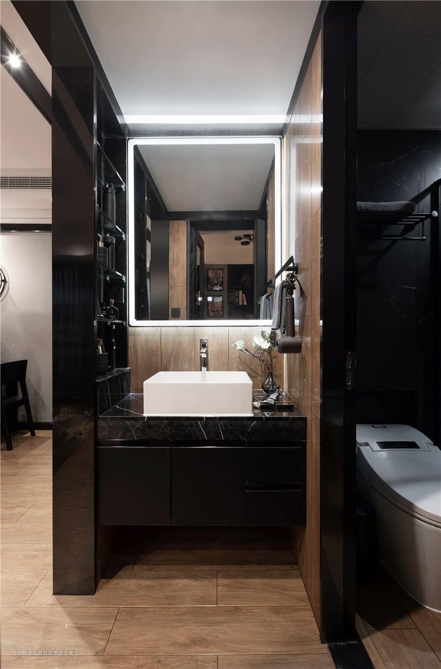 卫生间沿用整体空间的烤漆色+原木色的设计,吊柜的安置,让空间更显轻盈,时尚。