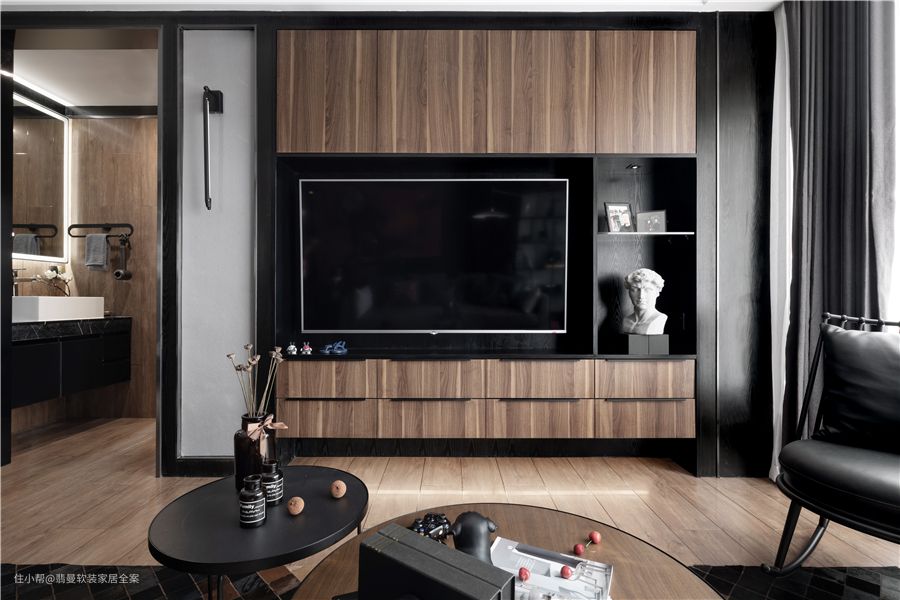 电视机背景墙用木饰面打底,形成舒适的背景墙,同时内部增加空间的储物功能,放置摆件也相当的精致。