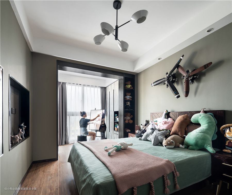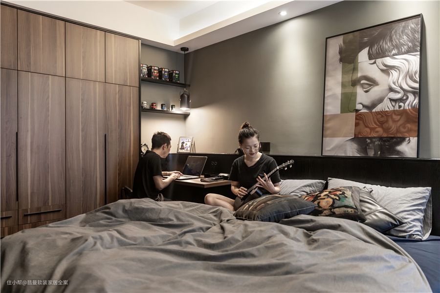 主卧的背景色选用灰色调,满屋的填充玩具和造型设计,显得二人生活更加的丰富有趣,主卧里充满爱的味道。