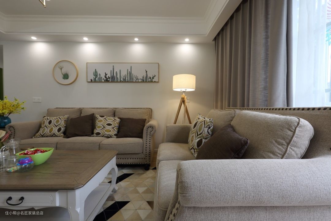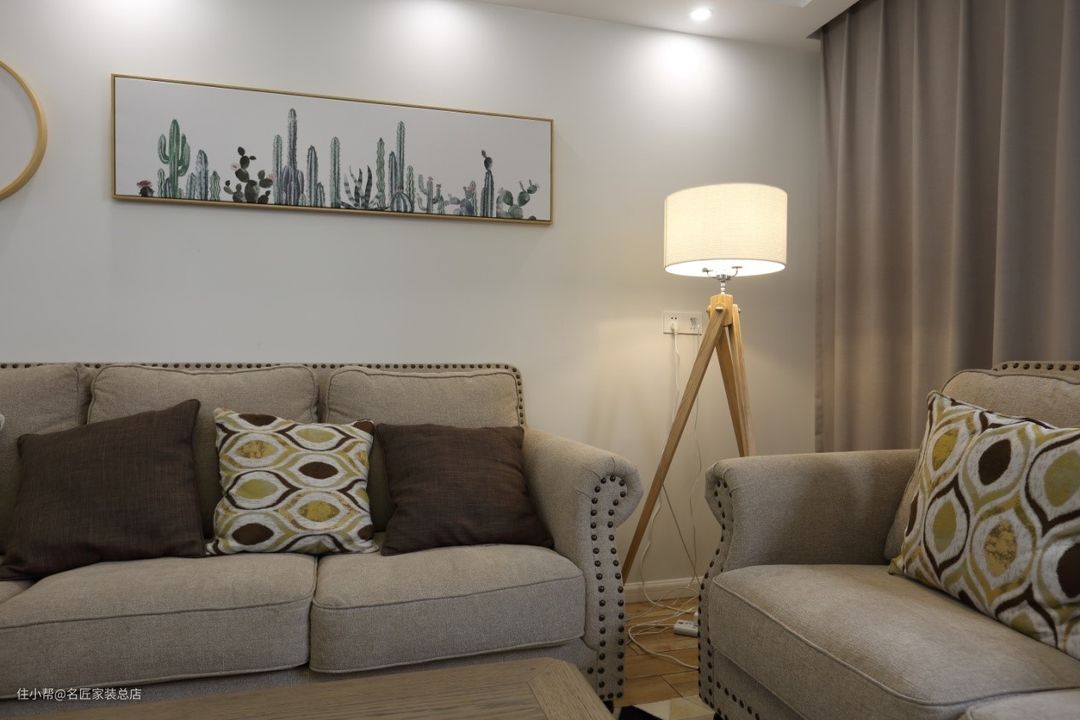 沙发之间空隙的角落放置了三脚架落地台灯,弥补空缺的同时适当增加室内的光线。