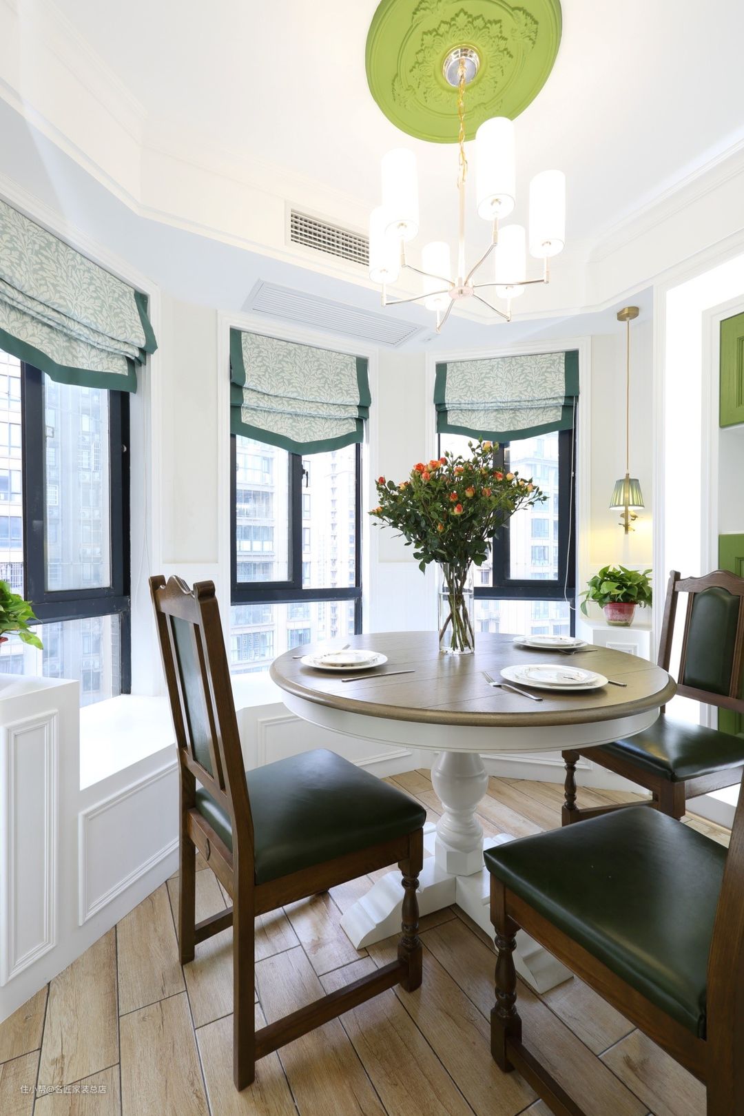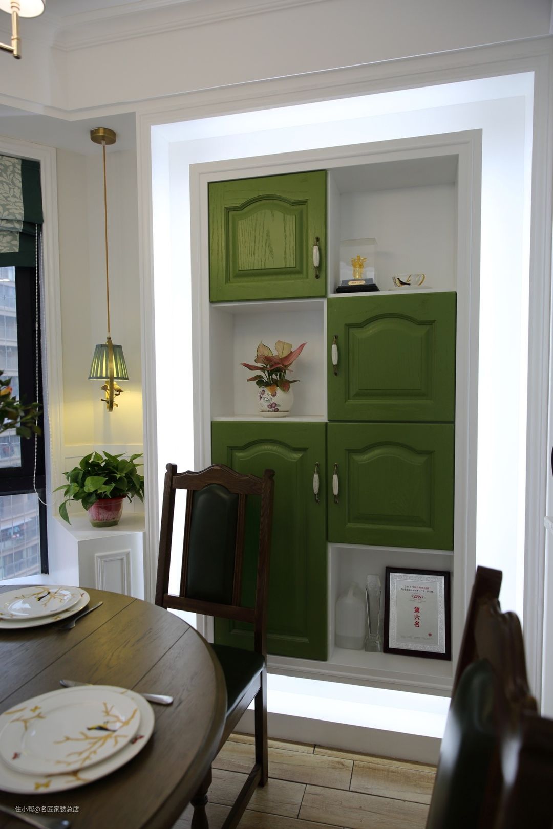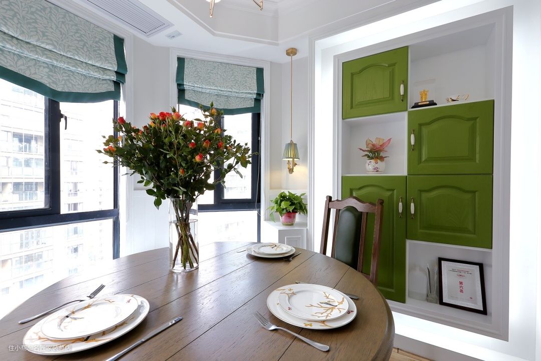 餐厅旁边设计了半开放式的白绿撞色橱柜,挡住一部分阳台,可帮助主人保留隐私,同时可摆放展示品和装饰物,真是一物三用。