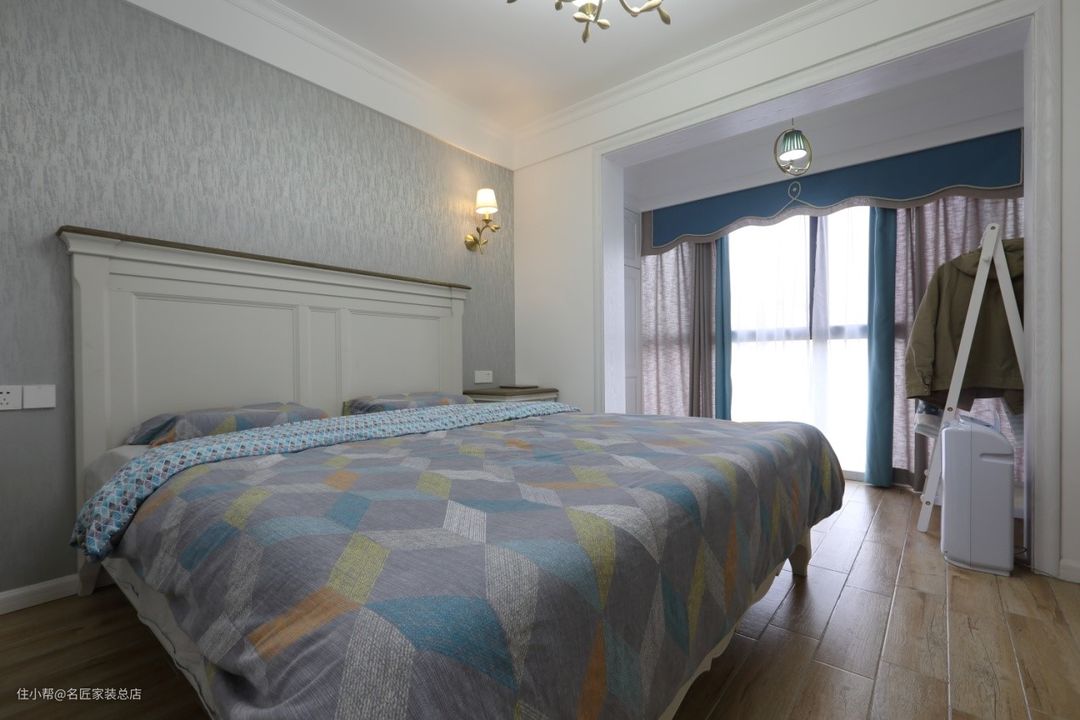 卧室根据不同居住人的风格进行了不同的颜色设计,主卧女主人优雅大方,颜色较为质朴古典,在阳台处放置了梳妆台和衣架,方便日常需求。