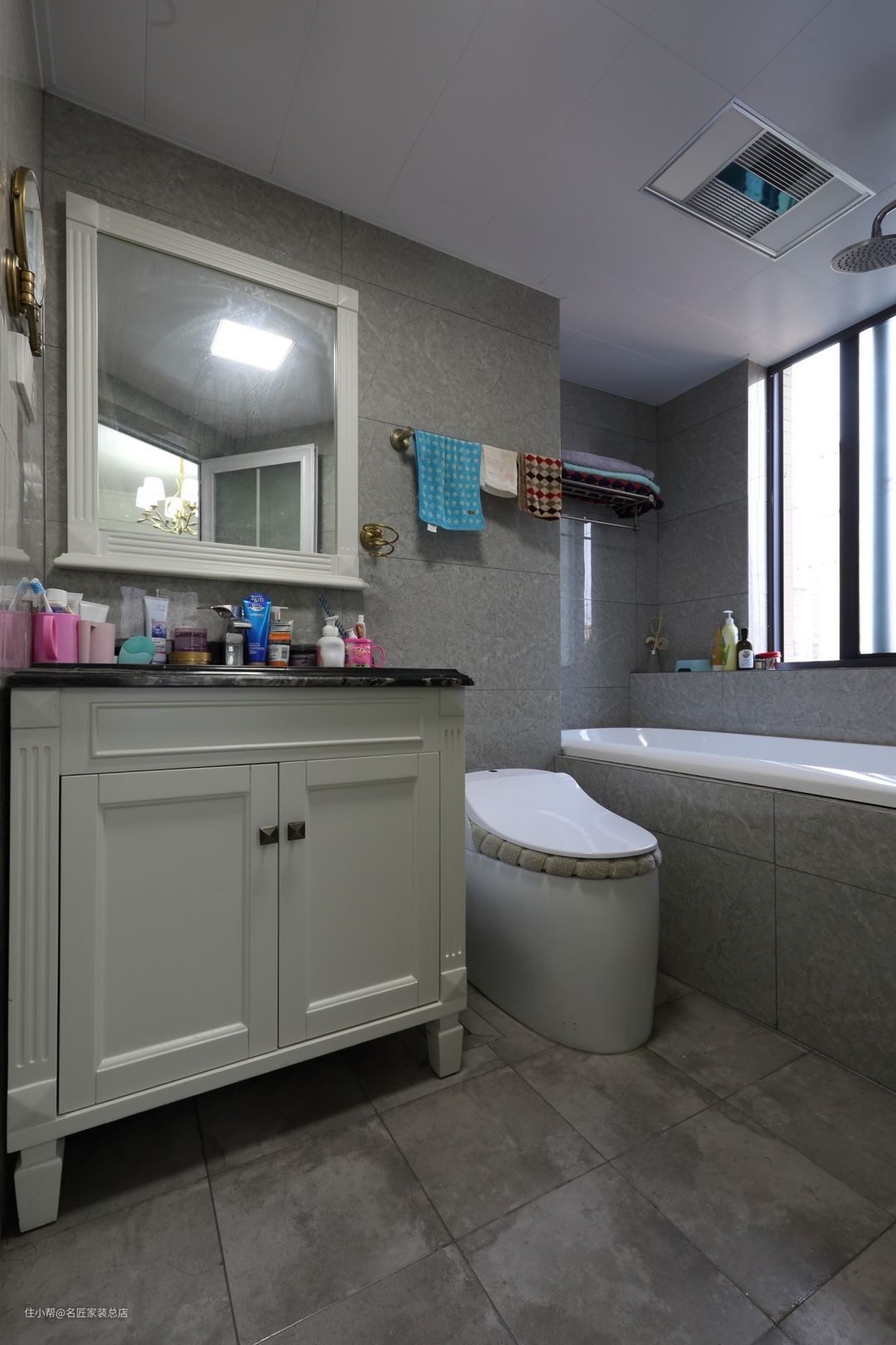 卫生间选择了灰色瓷砖的铺贴,让空间变得朴素雅致。根据业主的生活习惯设计了浴缸,偶尔也可以好好放松自己。