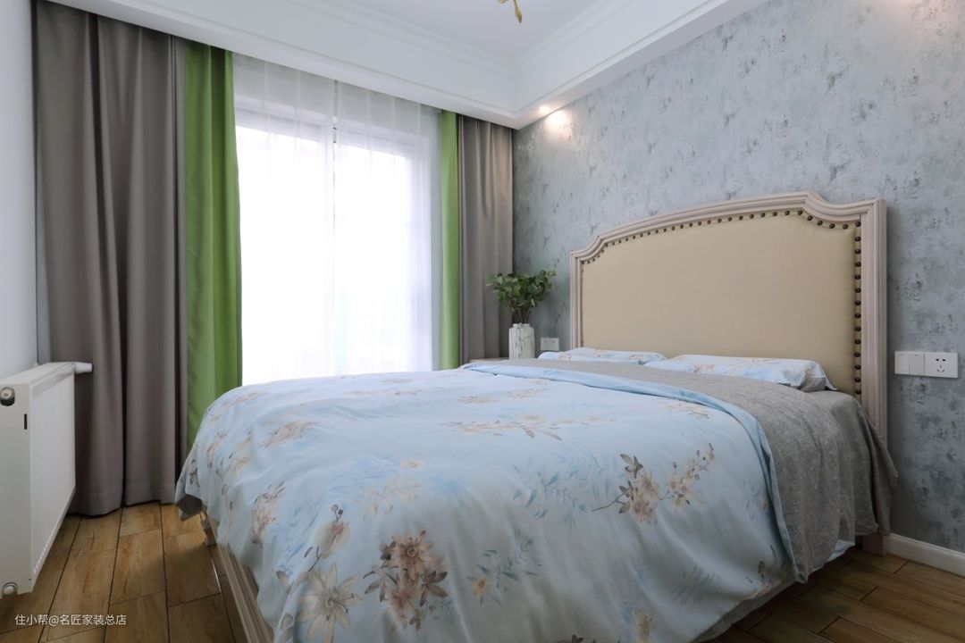 女儿房较为清新,窗帘选用了灰色和绿色的搭配,一丝亮色给卧室带来明亮青春的视觉效果。