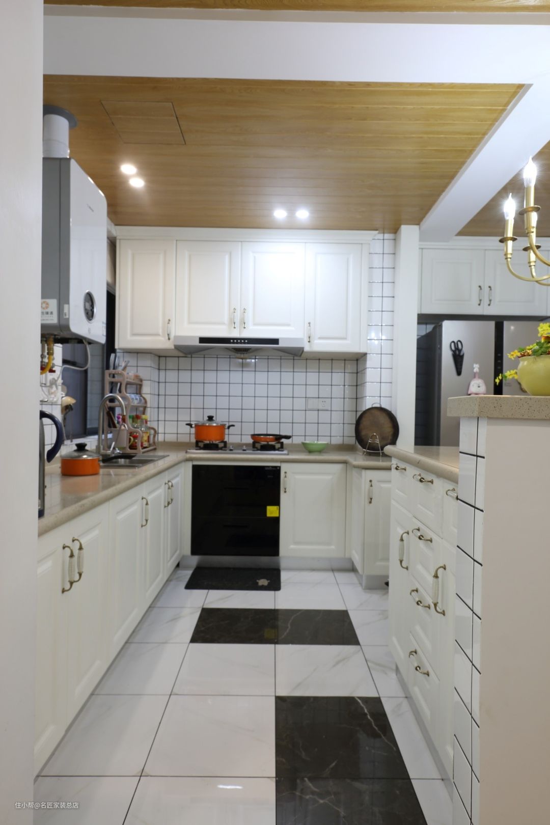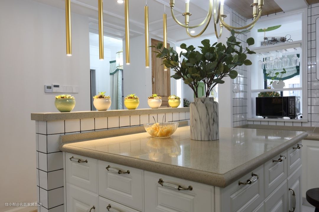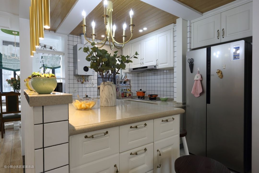开放式的厨房外设西式岛台,可以方便小电器操作和制作瓜果饮品。金属筒灯散发出温馨的光芒,让厨房也变成一个忙碌但是快乐的地方。