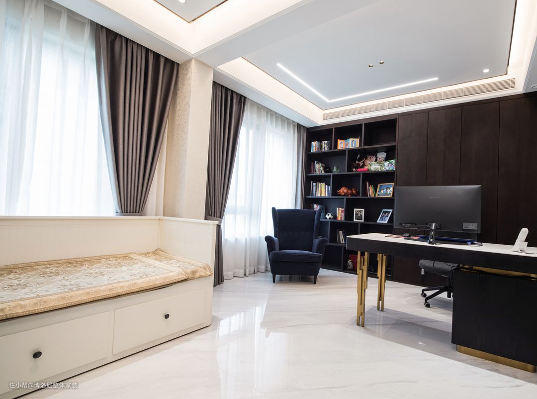 玻璃门采用和餐厅柜相同的风格,透明的材质,即使不推开门也能让书房区域融合到客餐厅的空间中来。 这个空间打通了一间次卧,作为书房空间的补充。家人们日常的工作、学习、阅读、都可以在这个专门的空间中完成;同时还配置了单人位沙发和长条榻,可作为临时休息区供客人使用。
