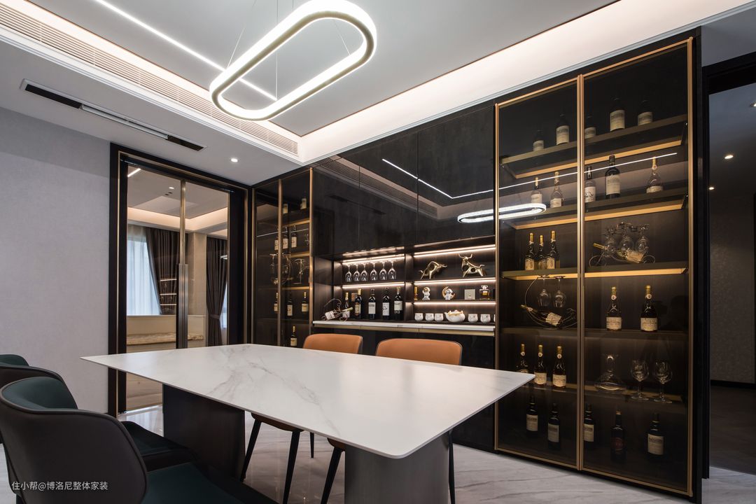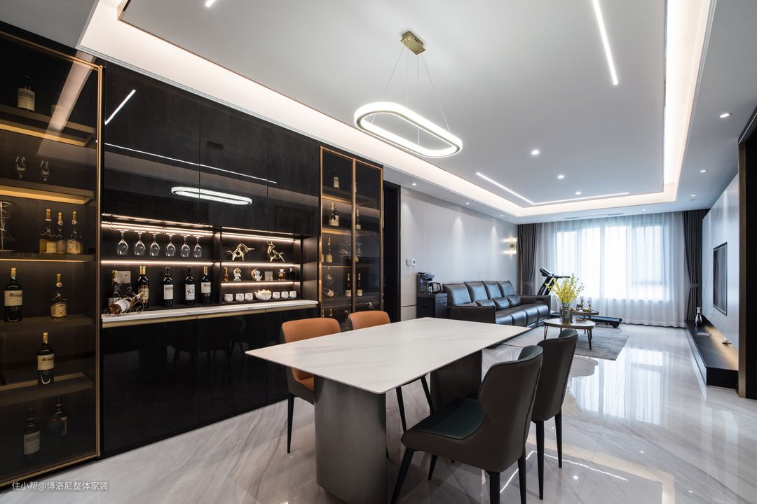 客餐厅之间没有明显的区分,黑白色、深咖色、黄铜色… …鲜明的颜色对比,造就现代风格的凌厉感。