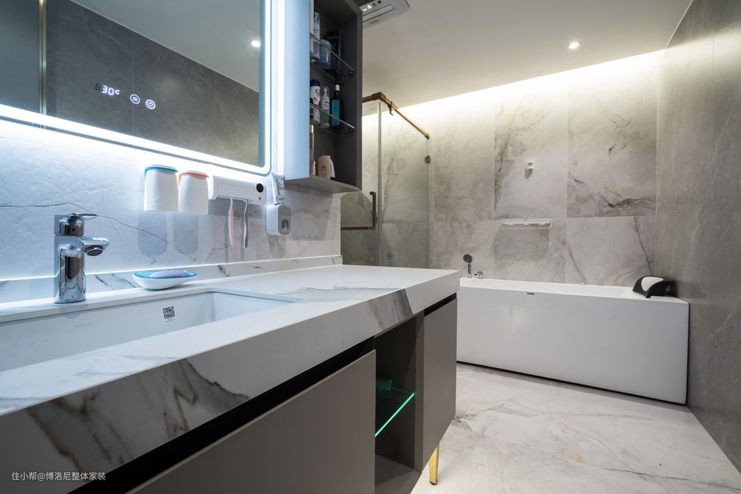 次卫的面积稍微小一点,会更注重空间的利用。水池台面延伸至马桶上方,壁挂式马桶不占地方也更好打理。淋浴间处理成推拉门的设计,简约时尚,节省空间。
