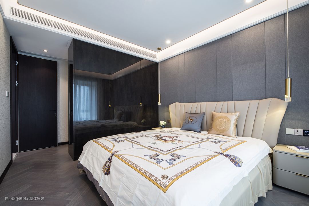 同样的简约风格,但卧室的色调比较柔和。为了营造放松的环境,设计师用暖灰色人字拼木地板代替了冷色瓷砖;硬包背景墙代替了烤漆材质。背景墙还专门做了大小不同的竖向线条分割,增加空间的变化与灵动。