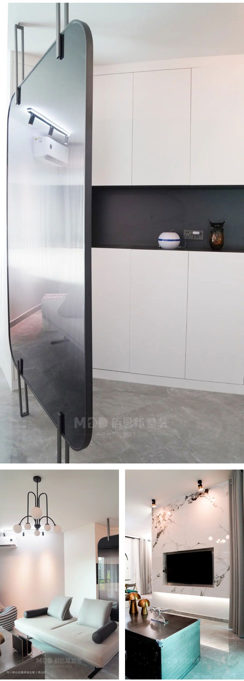 户乍看是一面墙 其实是一个大大的联排玄关柜 巧妙的设计让玄关柜有了容身之处 并且自带隐身效果 一面玻璃吊墙将客厅与玄关隔离开来 既避免了入户见客厅的风水忌讳 又美化了空间结构