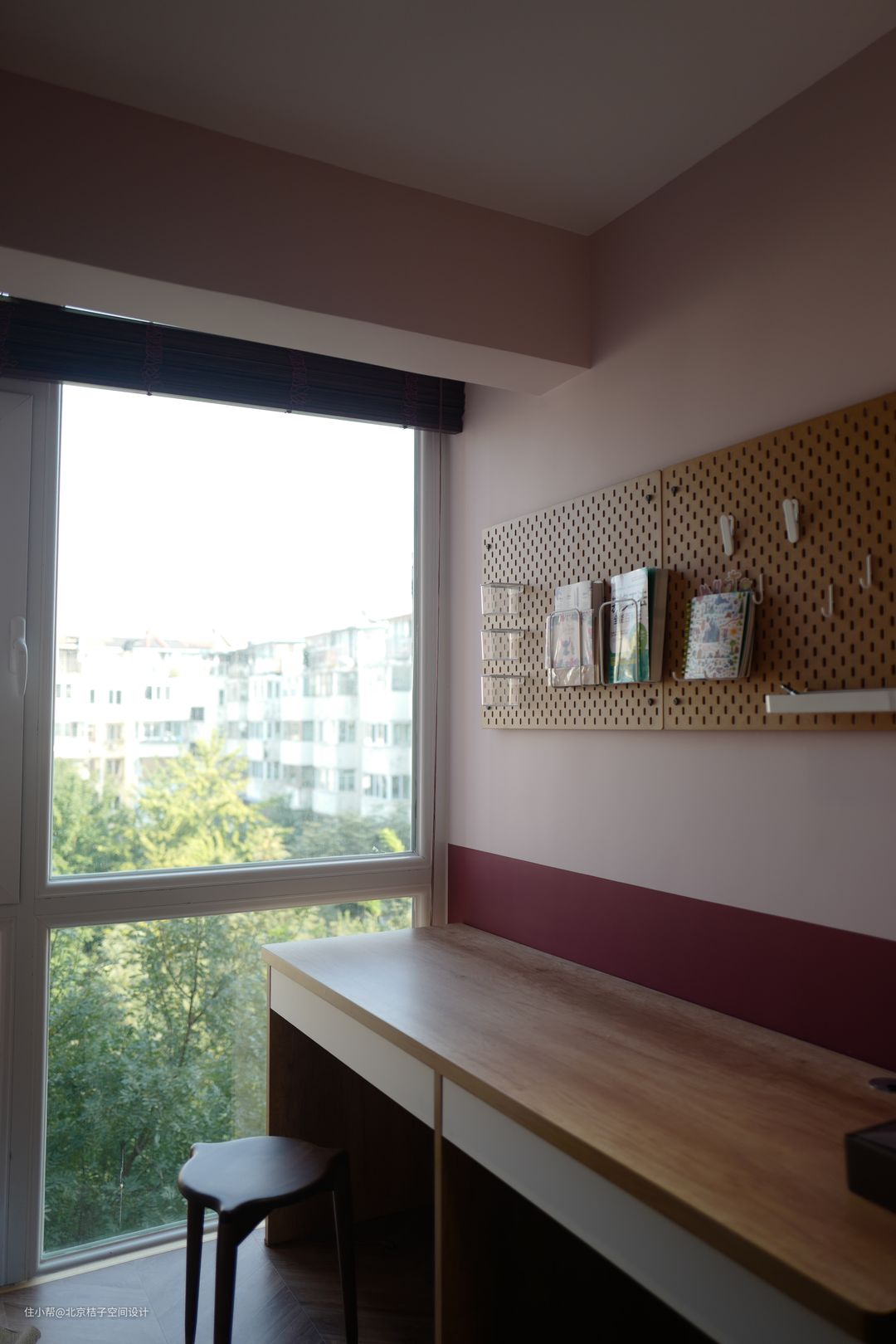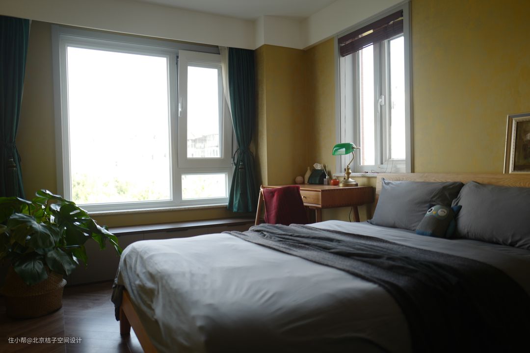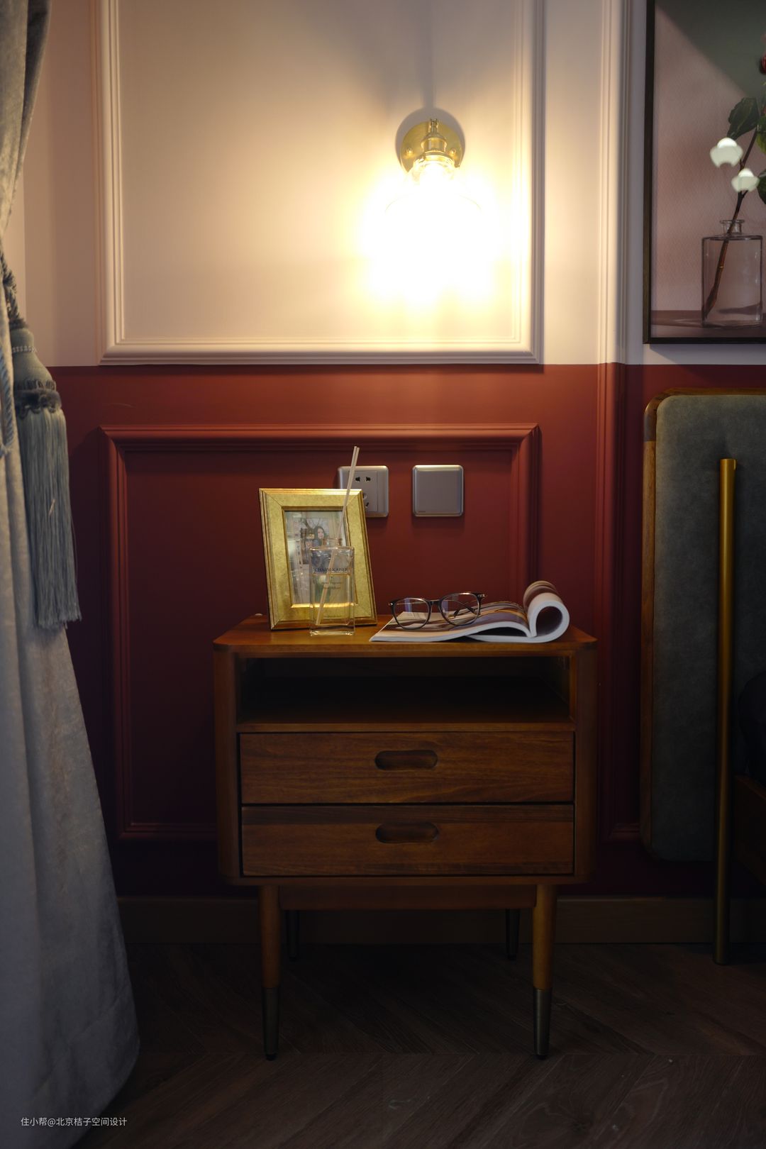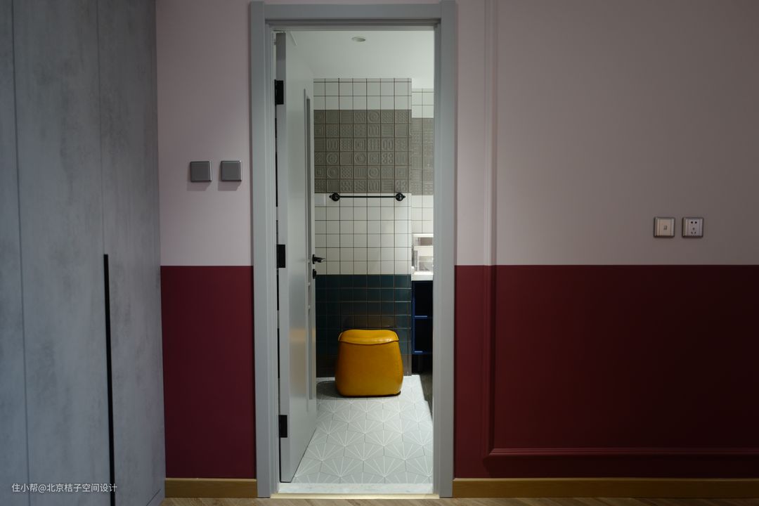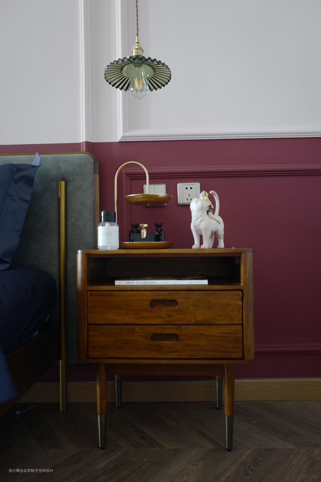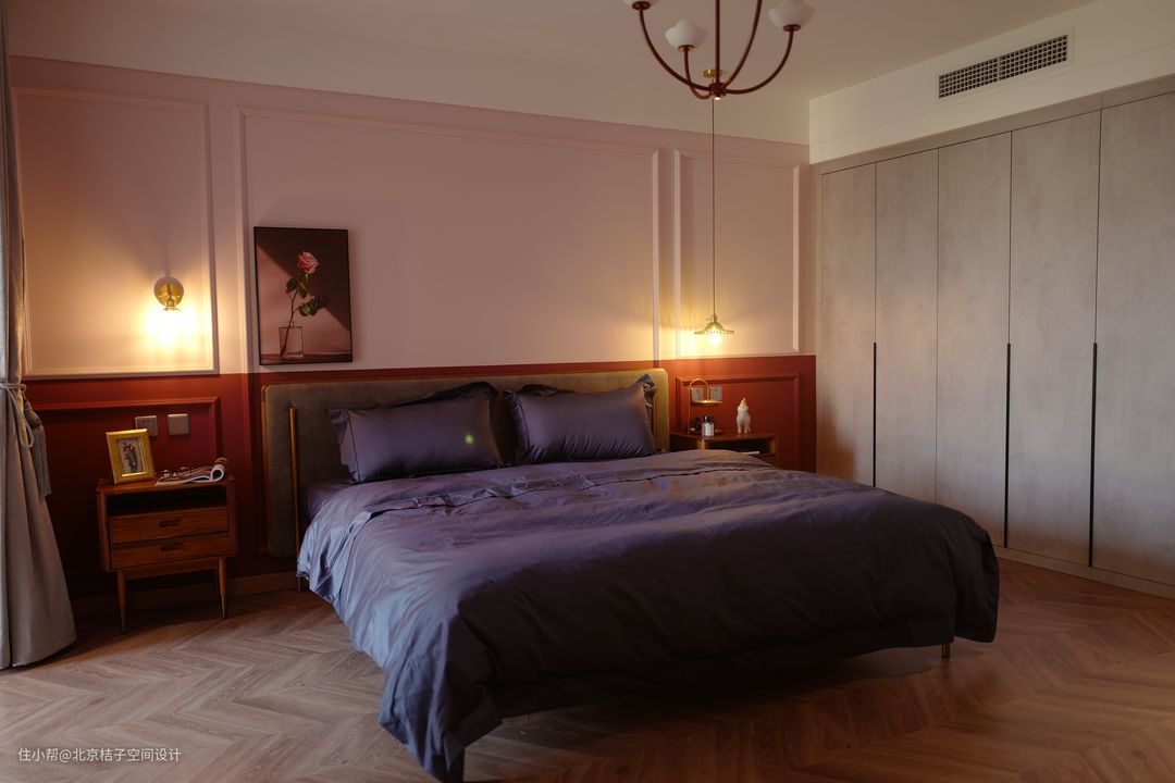 主卧是小马和老国的房间,想给这对刚步入婚姻殿堂的年轻夫妻营造一种浪漫、温馨、自由的氛围,所以在颜色的选用上也大胆选择了豆沙红拼色,床品用的是爵士蓝,一冷一暖的结合碰撞出了激烈的火花 墙漆:上墙 多乐士Esprit 下墙 多乐士Brave begonia 地板:德尔DN1803 主灯:凯灯格致家居(不过这款好像已经下架了) 壁灯+床头小吊灯:西早 装饰画:URFF DECO 粉色rose 床+床头柜:木陌