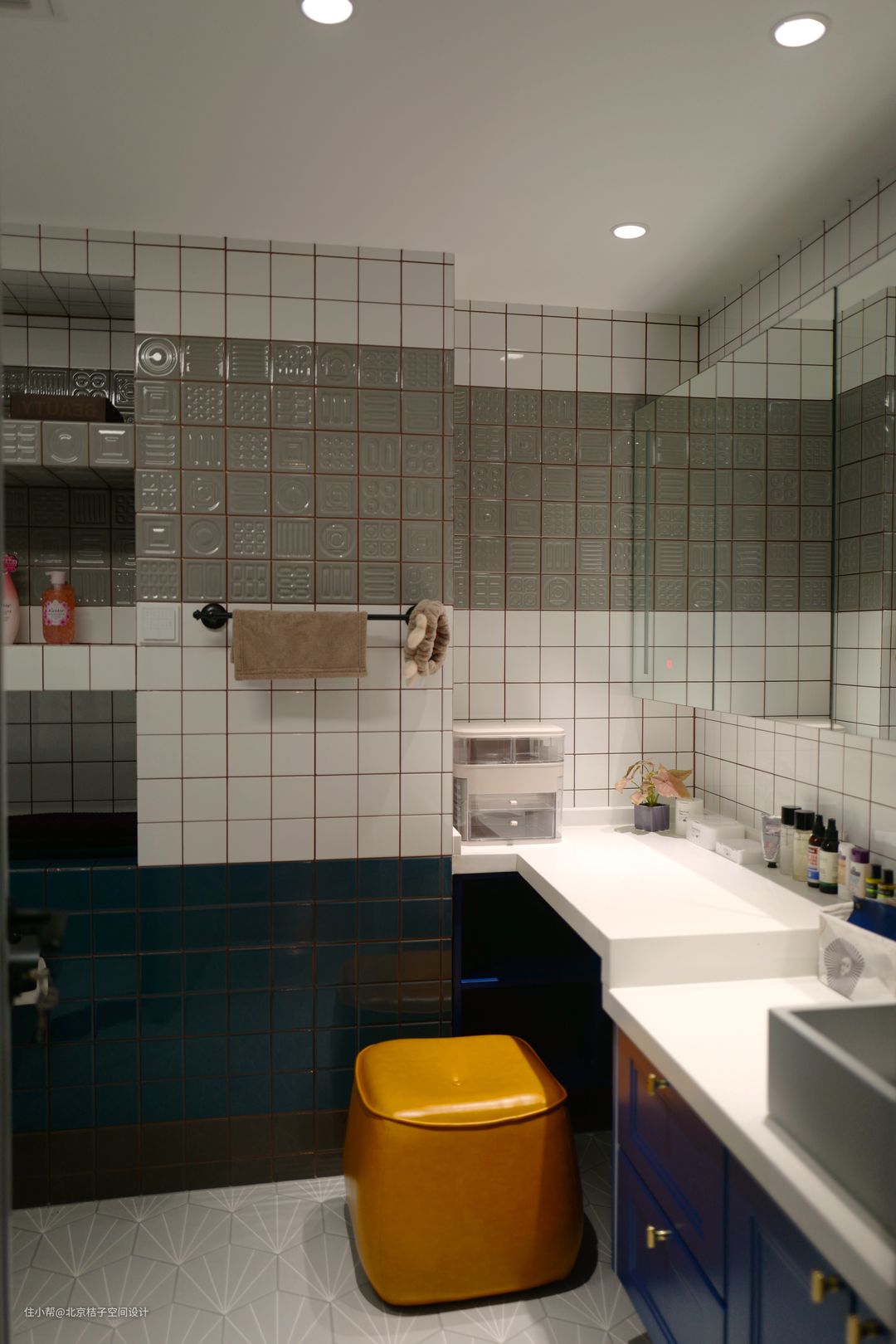 主卫的浴室柜是找厂家定制的,用的是蓝色进口烤漆板,所以瓷砖上也选了一款有蓝色的瓷砖,地砖也是和灰色的墙砖相配的