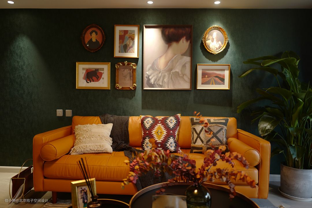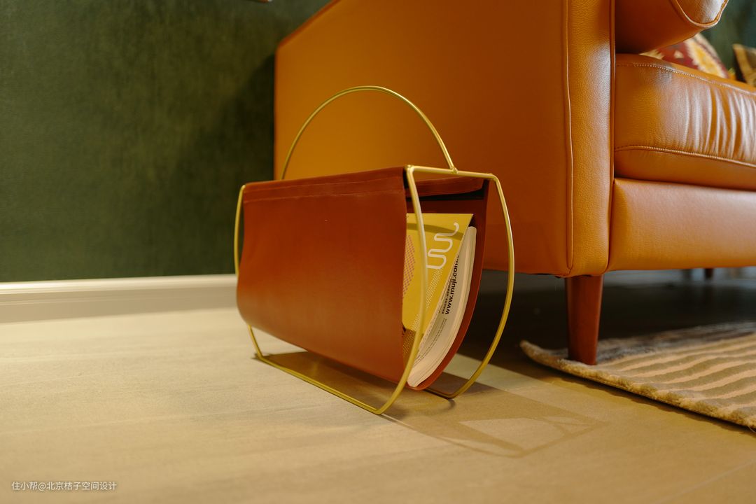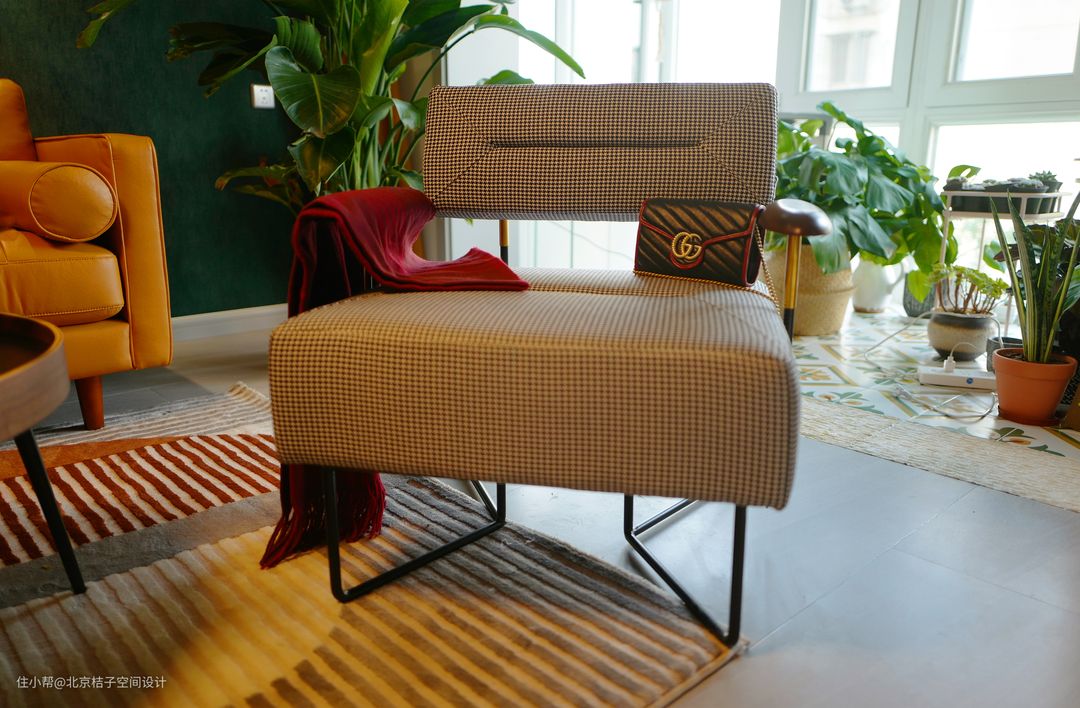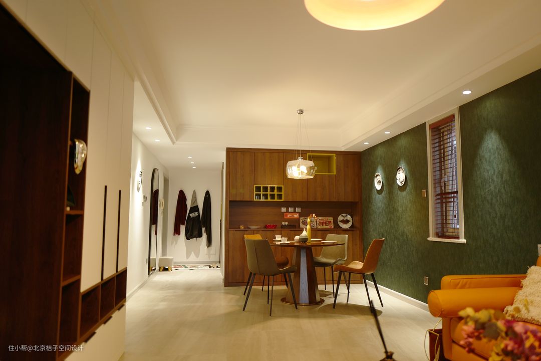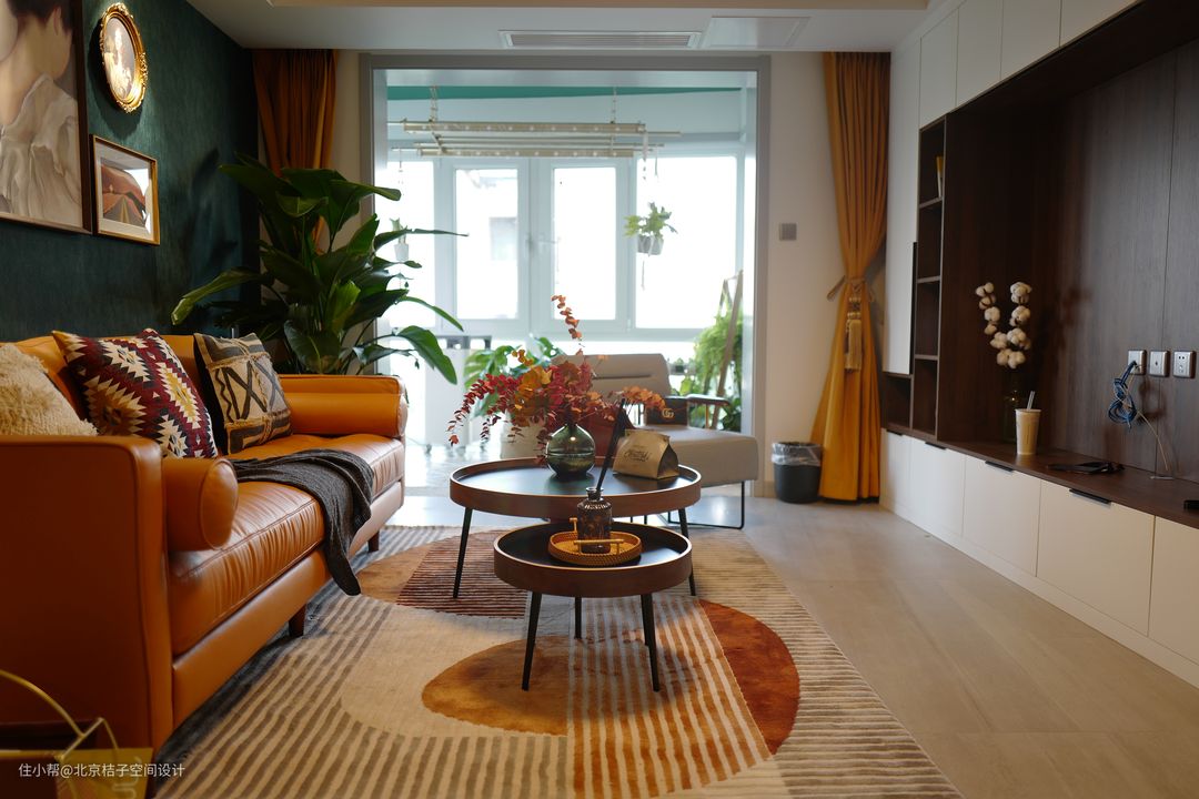硬装设计: 全屋都做了中央空调系统,所以客厅做了一圈吊顶,高度是30cm,边缘出做了一个阴角的设计,加些层次感 软装设计: 灯具:因为电视这面墙做了整体的电视柜,风格还是偏现代的,所以在灯的挑选上我没有采用那种复古感很强的水晶灯,而是挑选了一款造型简单的吊灯,它是一个黑色的外罩,里面就是吸顶灯。里侧的黄铜色跟沙发还是很搭调的 茶几:为了配合这款吊灯,我特意选择了两个圆形的茶几,胡桃木的边缘也和电视柜的侧板很搭 壁布:一直知道小马特别喜欢养绿植,且家中有很多的多肉,所以整体调子一开始就设定的以绿为主 沙发:为了跟绿色的壁布有一个强烈的对比,我选择了一款亮橘色的沙发,造型上也是很简单,给配饰上有更多的可能性 窗帘:选了一款比沙发颜色较浅的橘色,布料是很厚的那种,遮光效果很好,质感也非常好,但又没有沉重感 灯具:泰昌阳光 茶几:木也家具 沙发:牧缇家具 壁布+窗帘:龙冉 地毯:青山美宿 装饰画:Brusheep涂咩