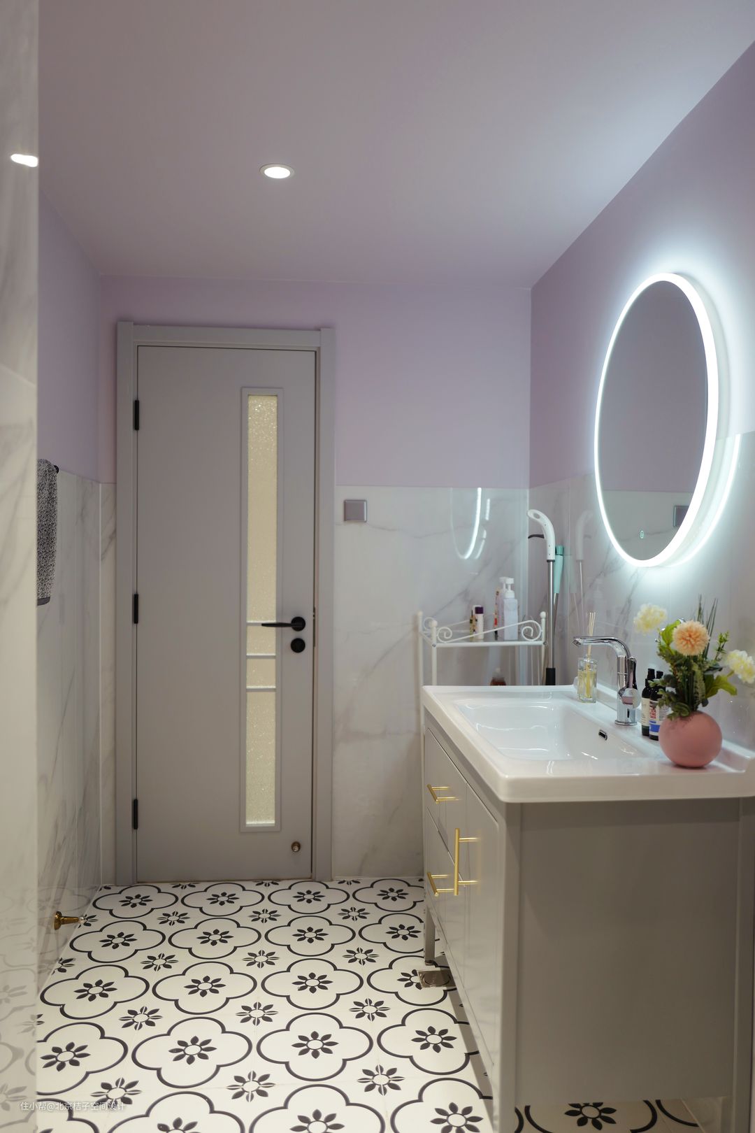过道的卫生间,也就是客卫,用的是防水漆+瓷砖的设计,瓷砖的规格是1500x750,所以就一整块直接贴上了,用了拉直器。顶面和墙面刷的都是淡紫色的防水漆,淋浴区做了一个60cm宽的玻璃隔断,上面镂空了一块儿,可以让水气从上面排出来,视觉上看也有种若隐若现的感觉