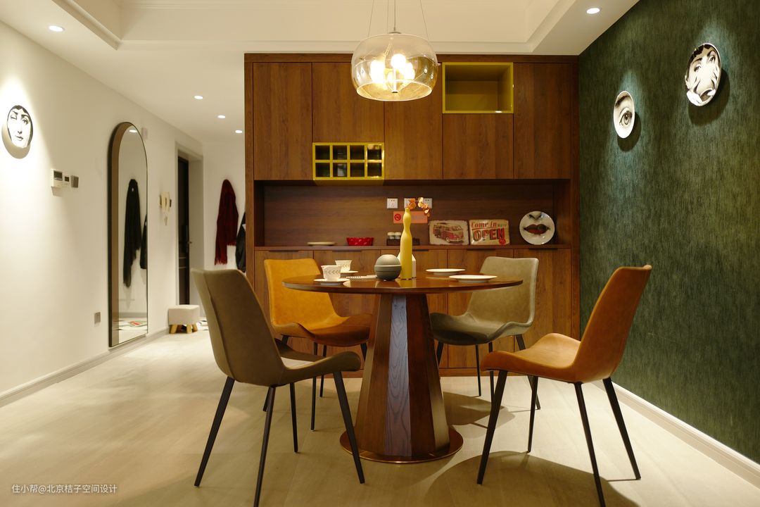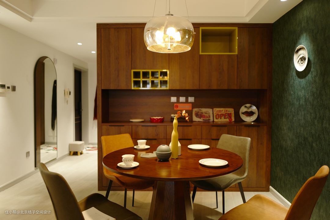软装设计: 灯具:餐厅的吊灯也是选的圆形,为了和客厅呼应。记得这款吊灯买的时候只剩最后一个了,还是个样品,才300多块钱,外罩是金属质感的,关上灯也很好看 餐桌:当然也是选择了圆形,中国人吃团圆饭嘛还是圆桌比较好,大家围在一起,比较有烟火气息 餐边柜:选用的是胡桃木色,为什么没选跟电视柜一样的白色?因为餐边柜还是深色的比较好,让人在这里吃饭看着就有食欲,包括灯的选择,餐厅的灯一定要选暖光源,我这里客厅和餐厅的灯用的都是3000K,暖暖的,很温馨 灯具:泰昌阳光 餐桌:木陌MUMO 餐椅:澳斯高