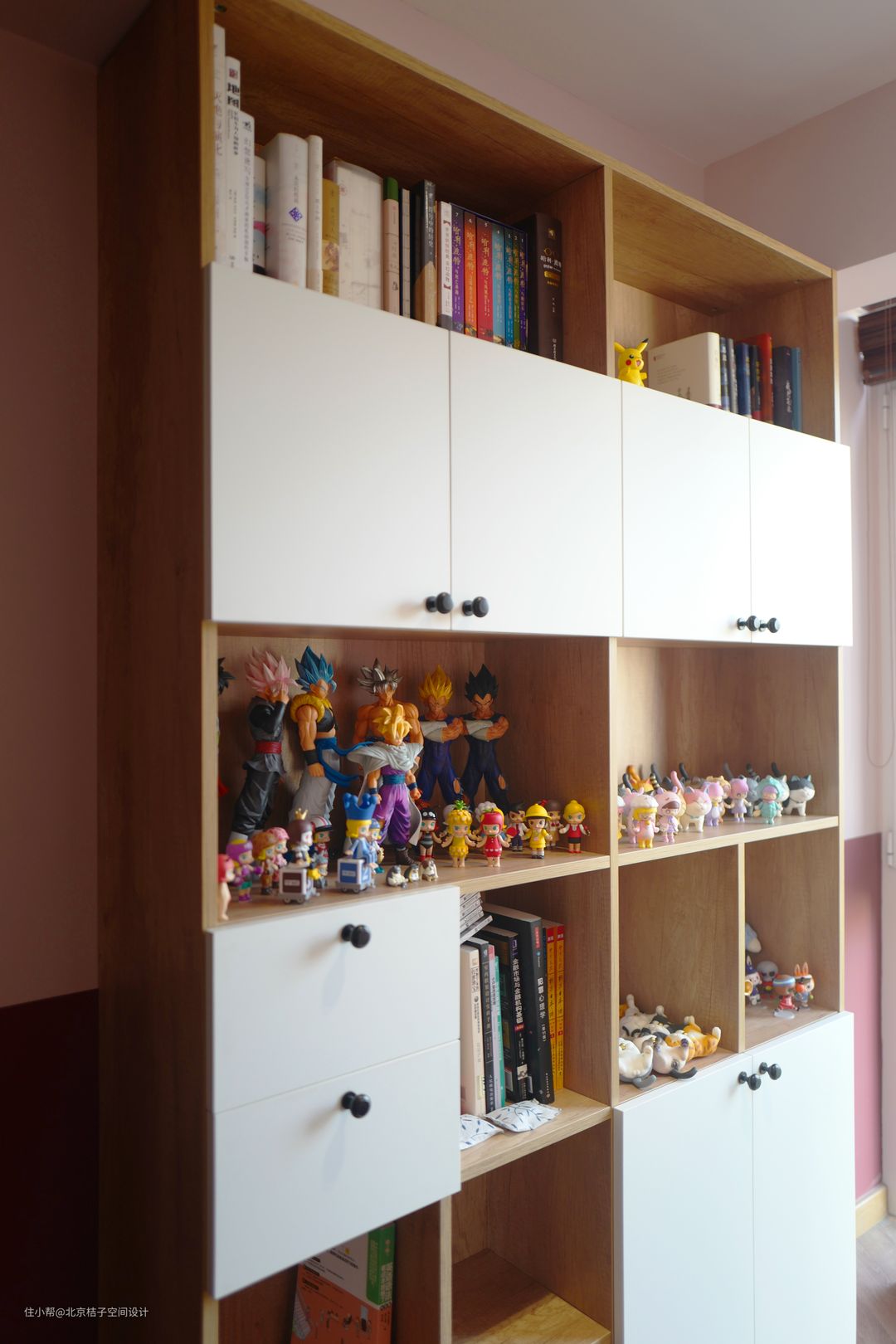 阳台做了一个写字桌和一个书柜,这一列就是书柜,上面摆满了小马的书和手办,小马是盲盒爱好者,老国又喜欢动漫,所以这个柜子是为他们量身定制的