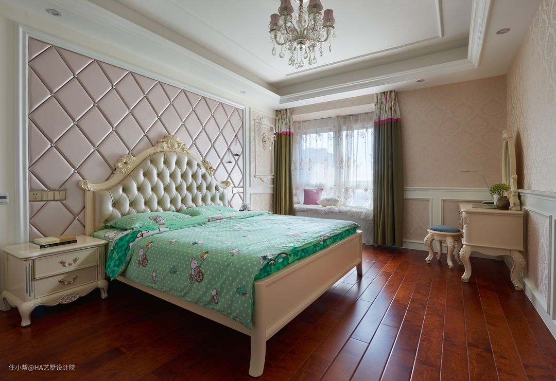 主卧的设计大面积使用白色、和欧式花纹的墙纸还有传统布艺,时期沉静雅致。精美的水晶吊灯、丝质的床上用品,就这样很好的营造出了优雅奢华,粉色窗帘使得整体在高贵中又体现一丝温馨。 床的主体采用深色系的皮革为主调,家具配色均和了整体。让我们沉浸在了舒适、时尚典雅的氛围中。