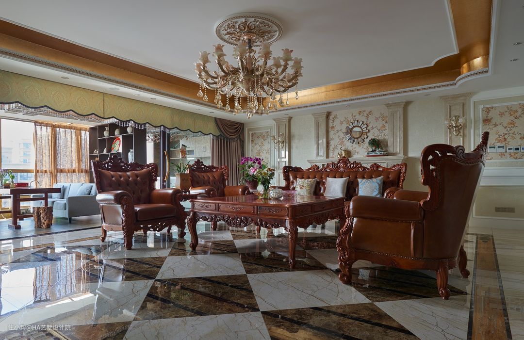 客厅的空间在具体的界面形式、还有主要配线方法都传承了古典、还有色彩的搭配也是具有传统古典风格的尊贵和优雅。在这其中部分现代元素的加入,又把时尚、靓丽很大程度地融入进去。 环顾整体,绚丽明亮的色彩、整齐且流动的线条、以及华美宽大的家具。还有地板与天花板以金色为主的配色,都在一一呼应一致。很好的营造出了一种传统都市阶级对房屋整体的考究和气势。