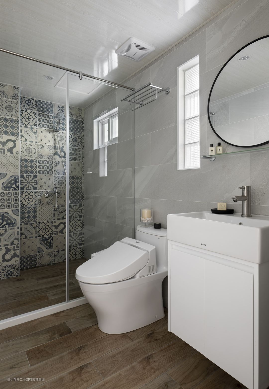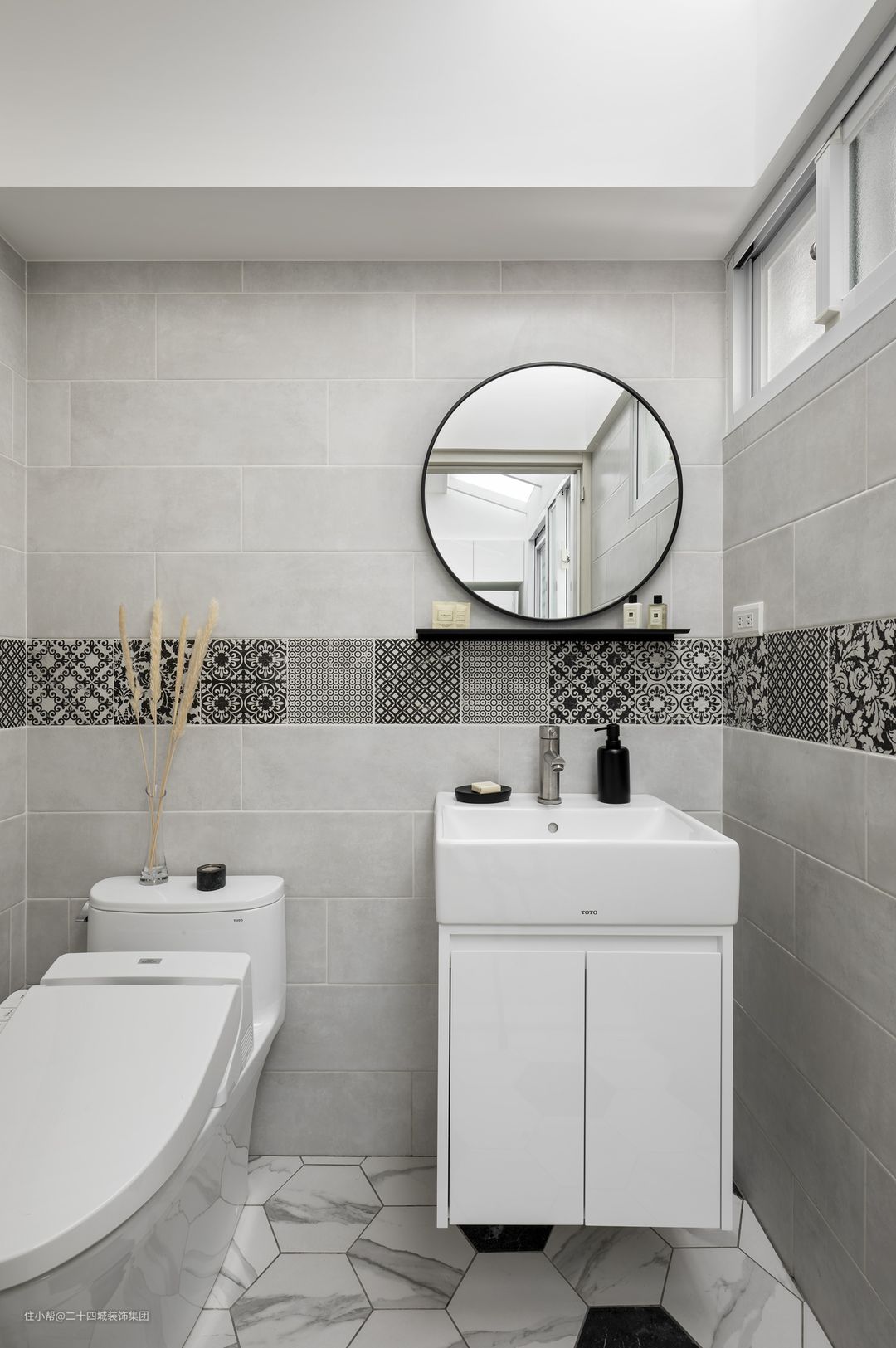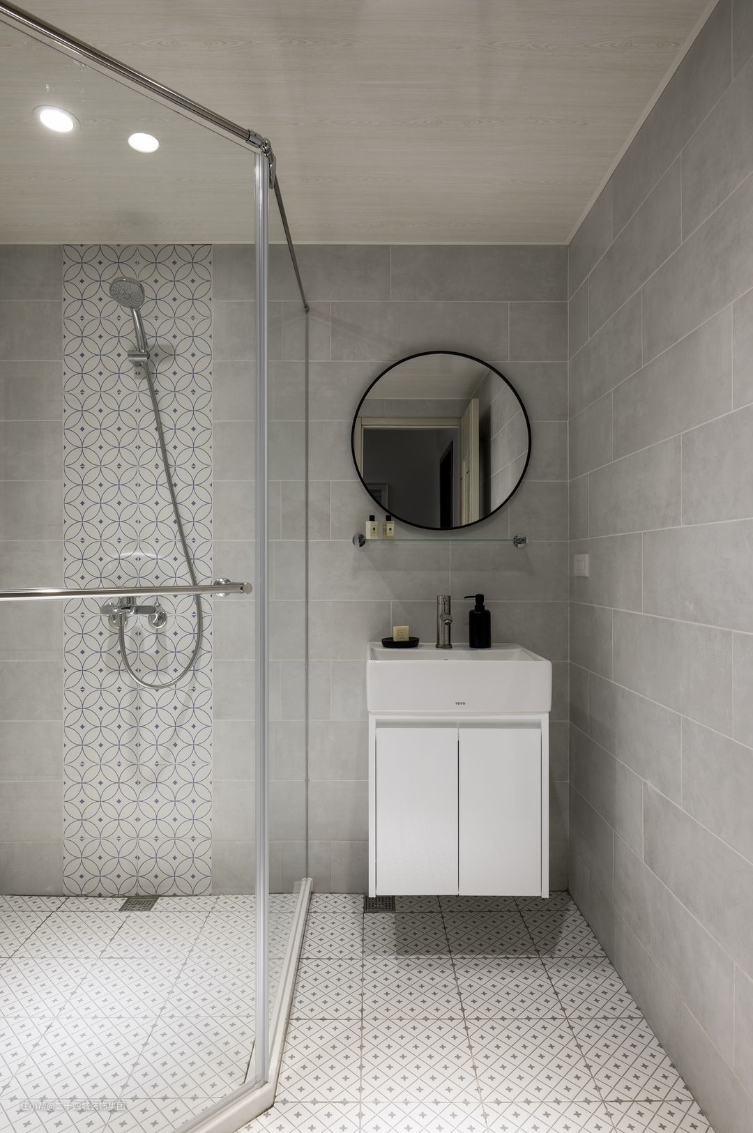玻璃隔出淋浴区,墙面铺设灰色瓷砖,留出一面铺设低饱和度的拼接花纹瓷砖,带有一定趣味性及观赏性。白色的洗手台搭配圆形黑边镜,很有质感