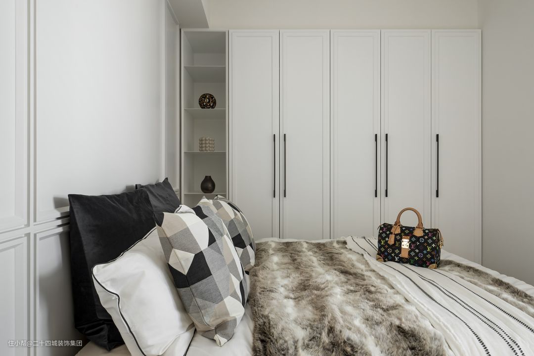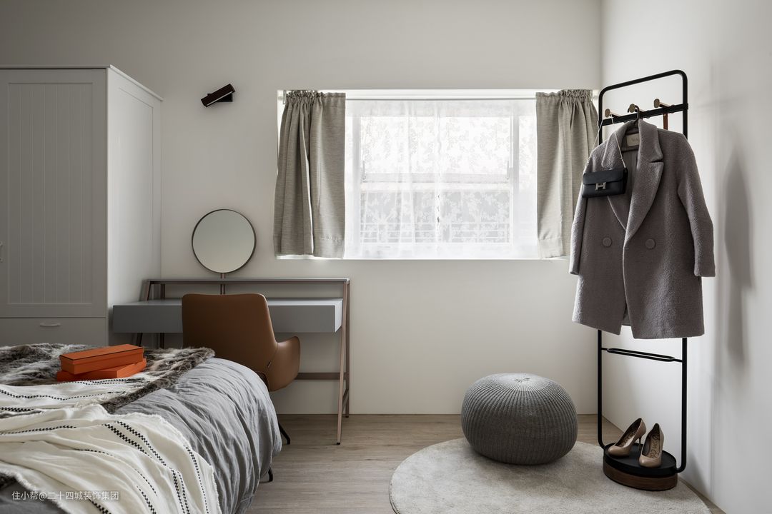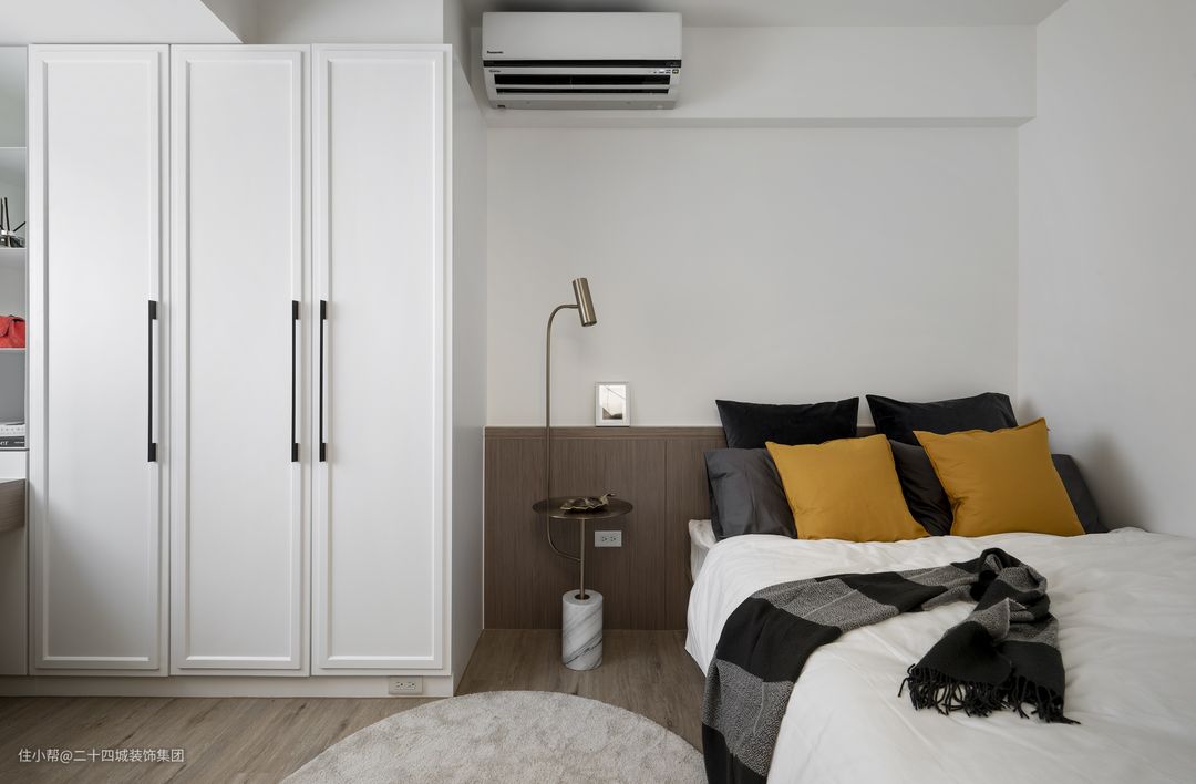 床头摆放的金属床头架很有质感,衣柜用简单的白色搭配黑色把手,简约大气,白色的墙面未多做装设计,显得室内宽敞又明亮