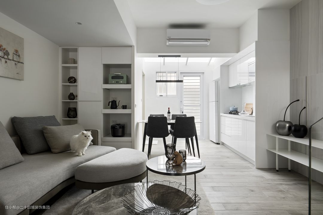 开放式的厨房与客厅餐厅在同一空间内,加上白色镜面的橱柜设计,使得室内更加宽敞明亮。