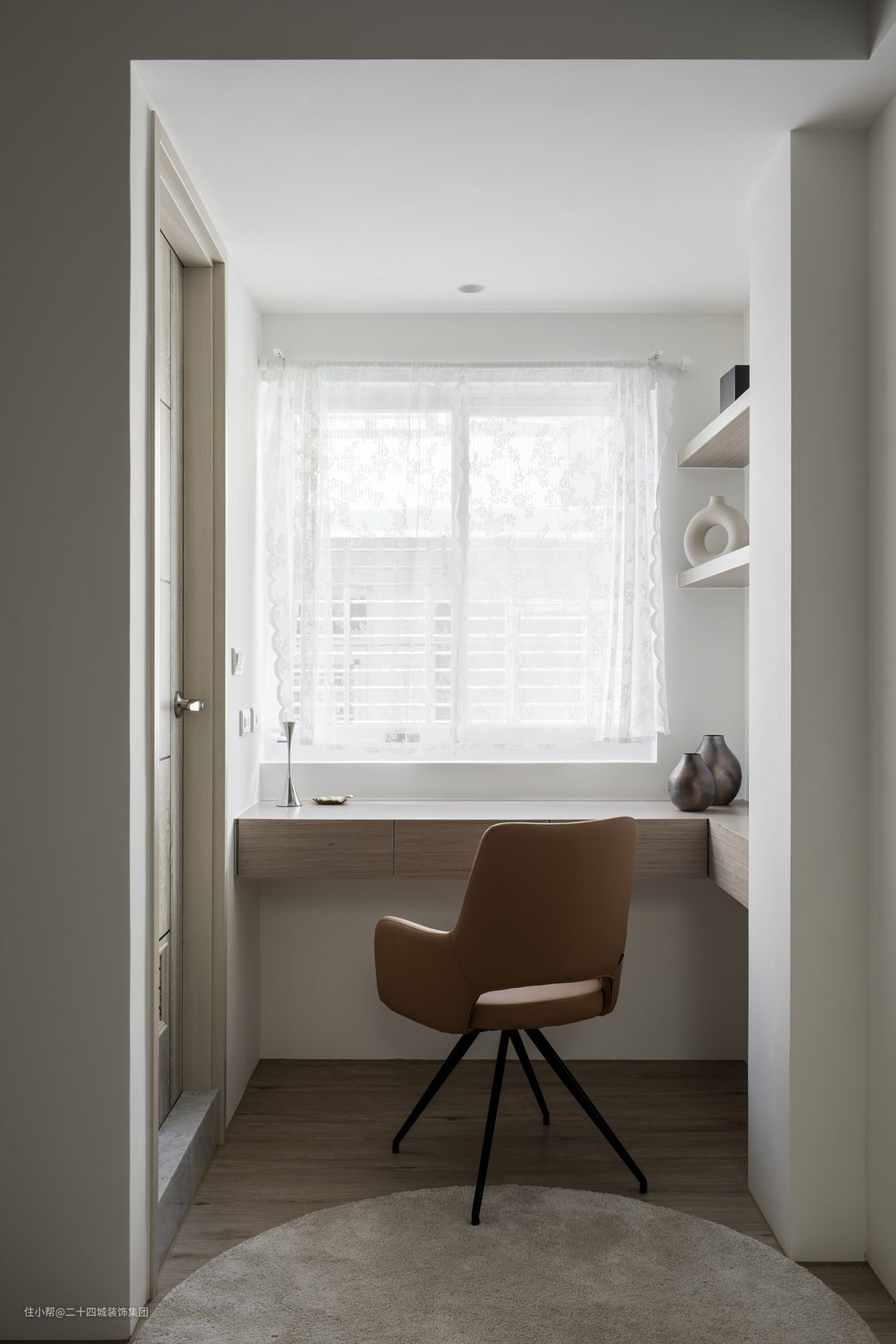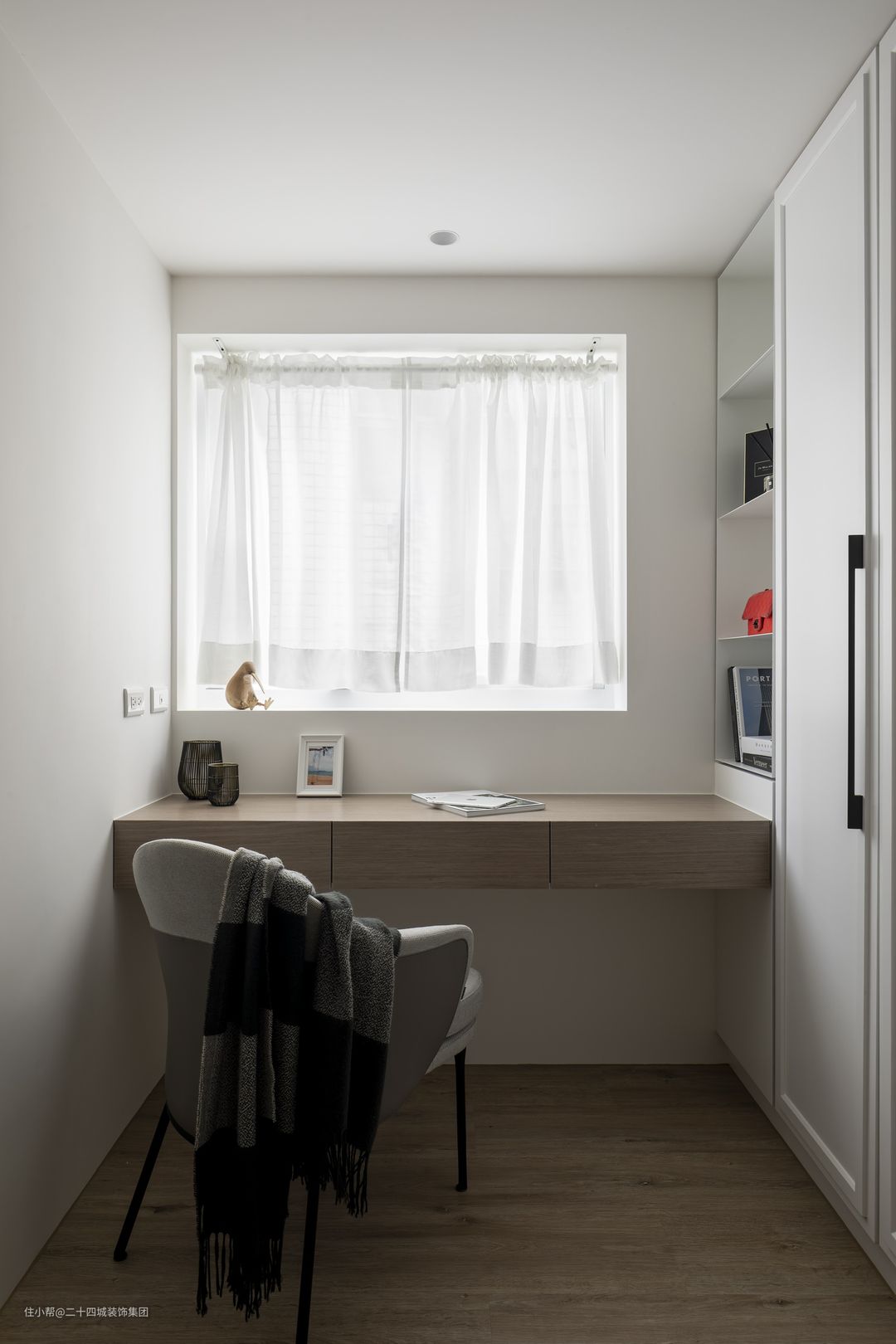 和主卧一样在窗下做悬空柜充当书桌,上方一个投射灯满足照明需求