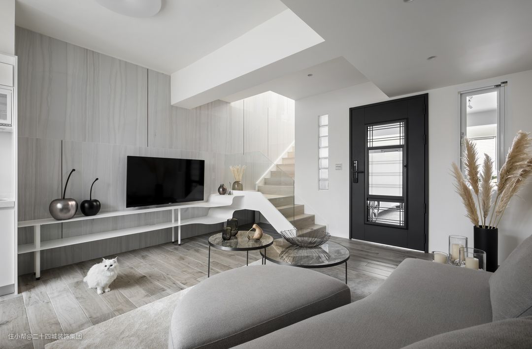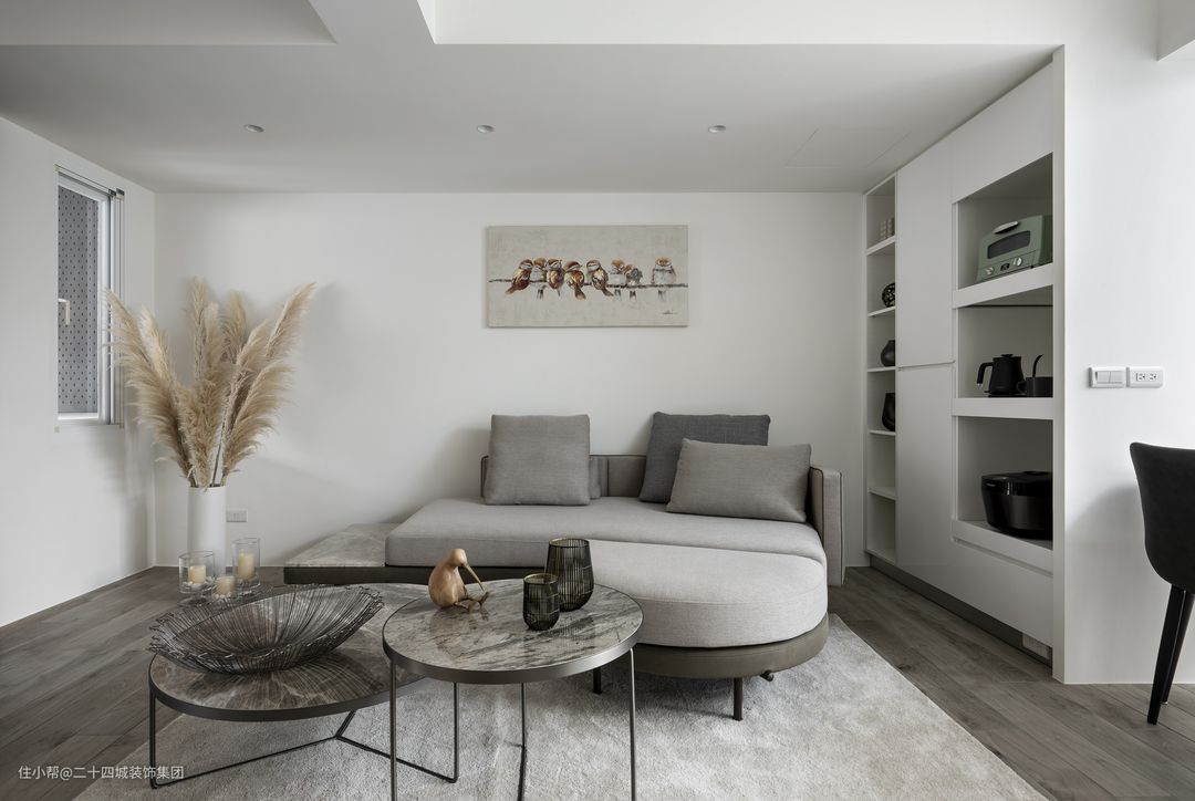 客厅主体色调为灰白色,白色的墙面搭配装饰画,灰色的布艺沙发、抱枕+灰色地毯、地板,通过极简的设计手法和高级的配色,打造出自然原色的空间质感,墙壁上做开放式系统柜,满足储物需要