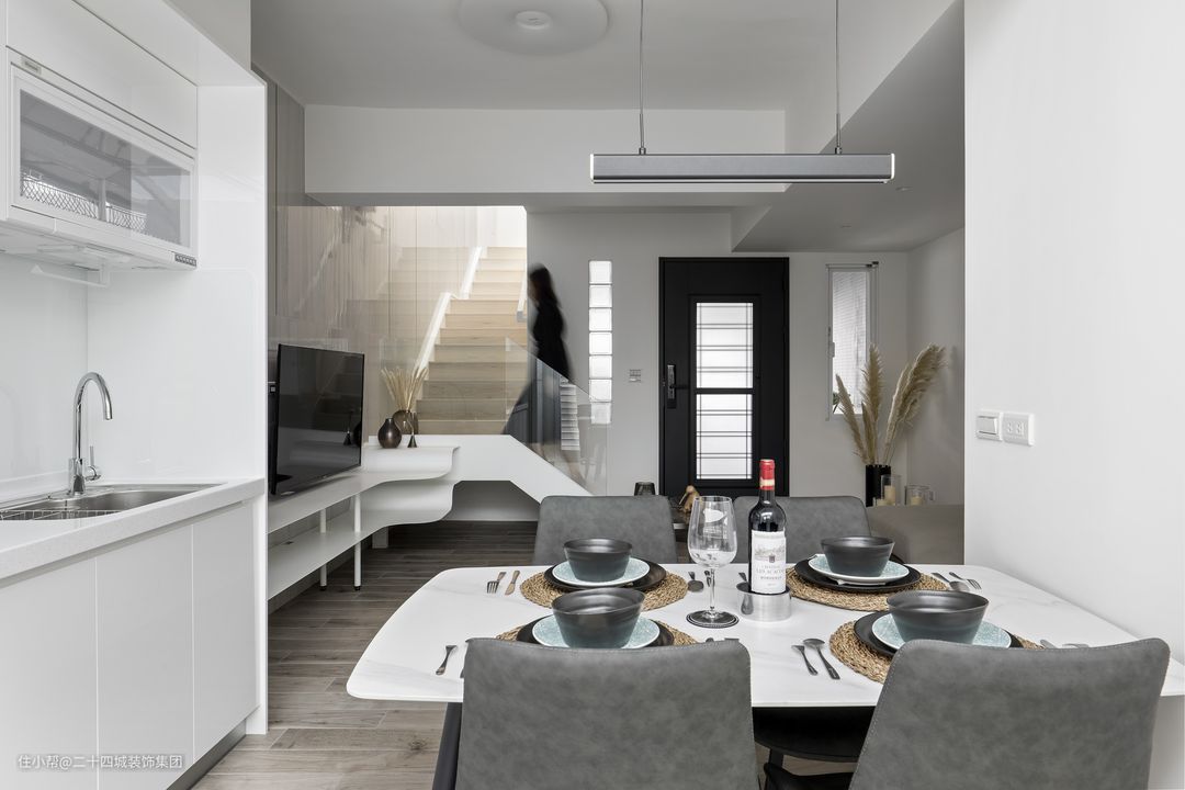 餐桌以白色岩板桌面配木质桌脚,餐桌上方悬挂长条金属灯具,再搭配灰色皮面桌椅,显得简约又有格调