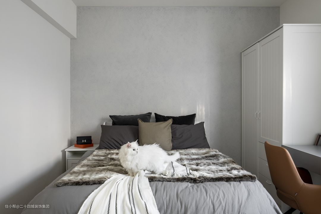 同样的灰色调,灰色的墙面、床上用品加化妆台,搭配白色的立体衣柜,高级感十足。