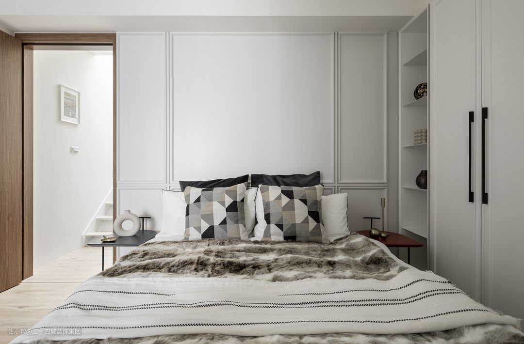 主墙面为白色+线条的饰面,充满艺术感。床头摆放细脚矮桌,显得简约不厚重。旁边做系统柜,开放式的层柜方便物品摆放。