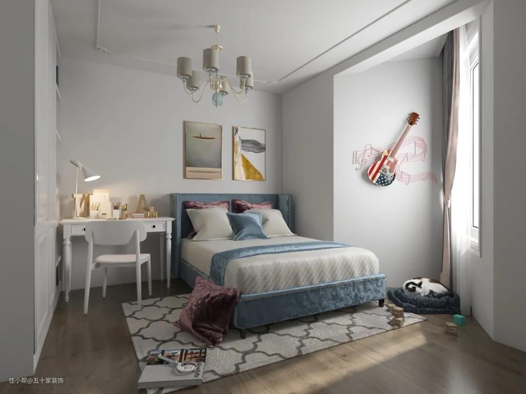 业主女儿年龄较小,所以女孩房避免了使用复古的殷桃红色的家具,而采用了欧式的威尼斯系列定制柜,床头背景采用浅蓝色背景,使得整个空间在复合原来整体设计的前提下,年轻有趣,生机勃勃。