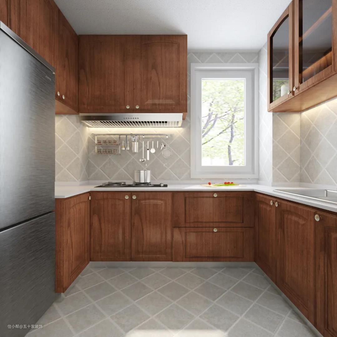 U型的厨房设计,大大增加了橱柜的储物量,整套橱柜采用苏格尔复古殷桃系列,跟客户定制家具统一颜色和质感,使得整个空间遥相呼应。