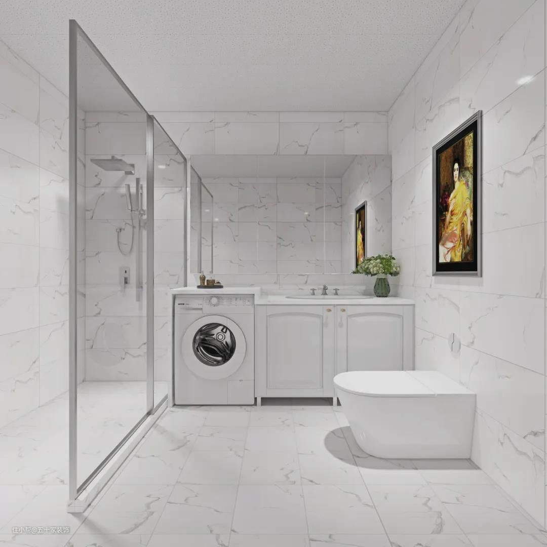 卫生间为暗卫,所以整个空间不再使用深沉的樱桃色,同样使用了苏格尔系列的白色浴室柜,整个空间也使用了大面积的白色仿大理石的墙地砖,使得空间面积从视觉上变大。