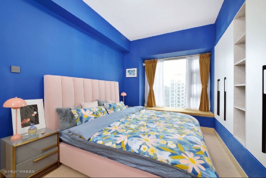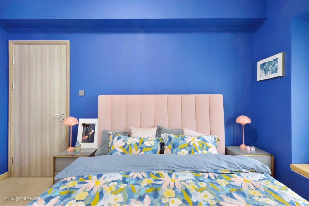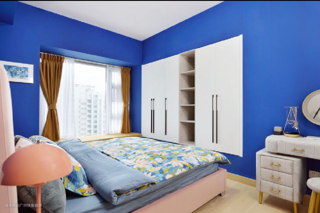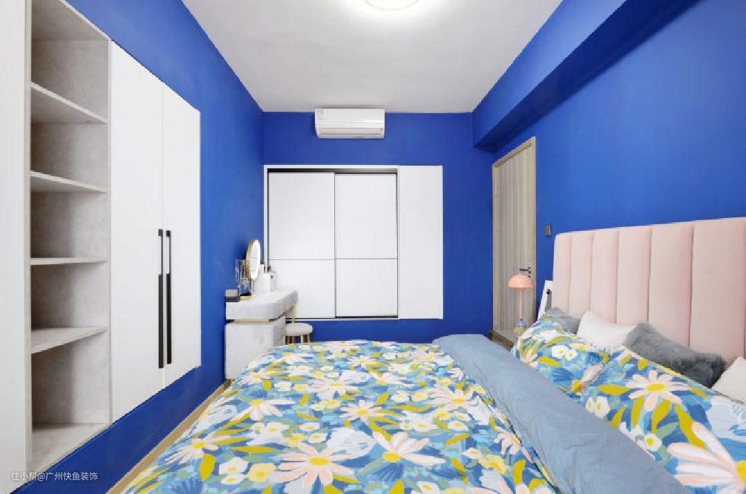 主卧墙体四面涂刷爵士蓝乳胶漆(色号:Dulux 30BB 10/337),搭配正白色衣柜及脏粉色床头靠背,梦幻十足。在墙角一侧设置插座,并在此放置梳妆台。