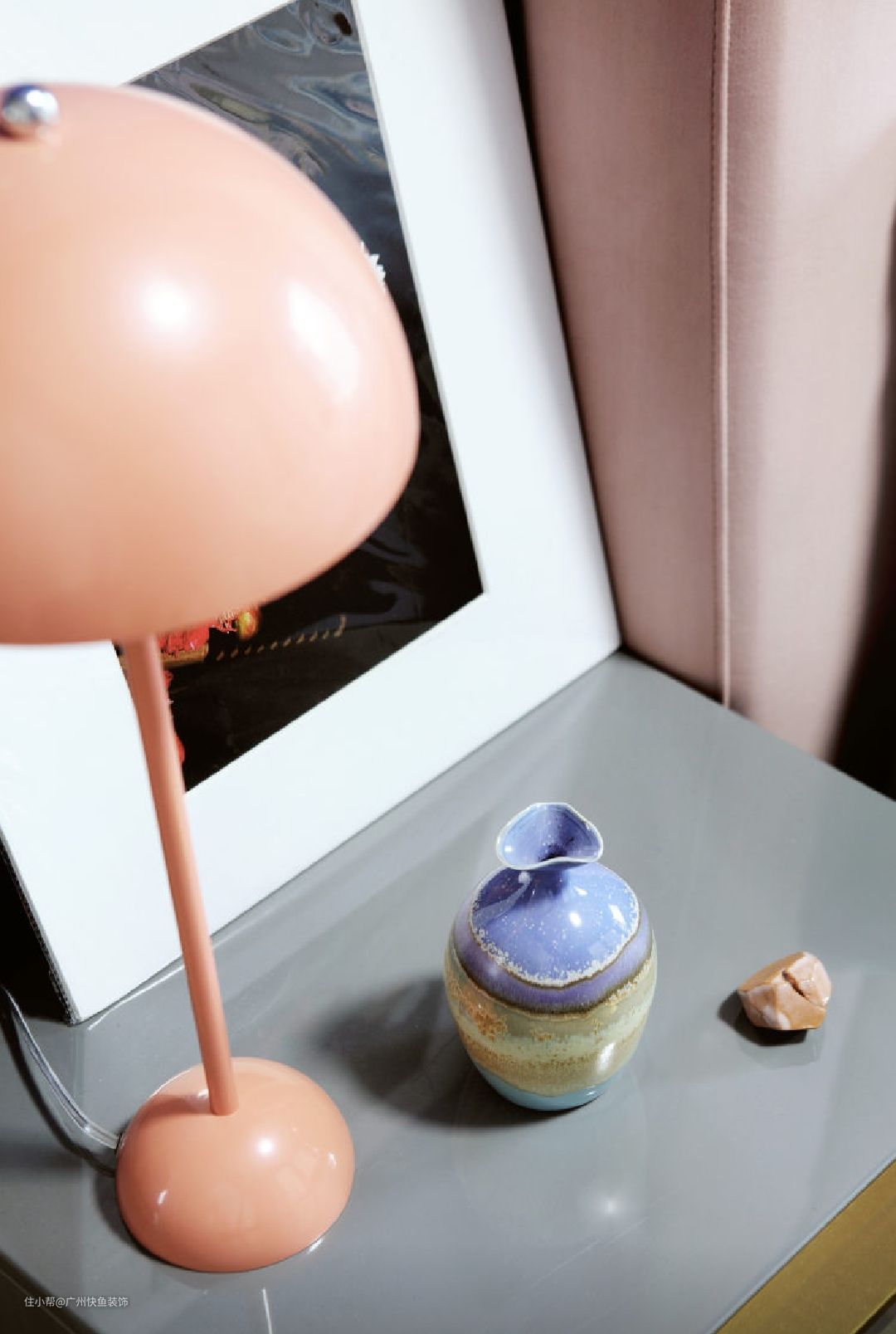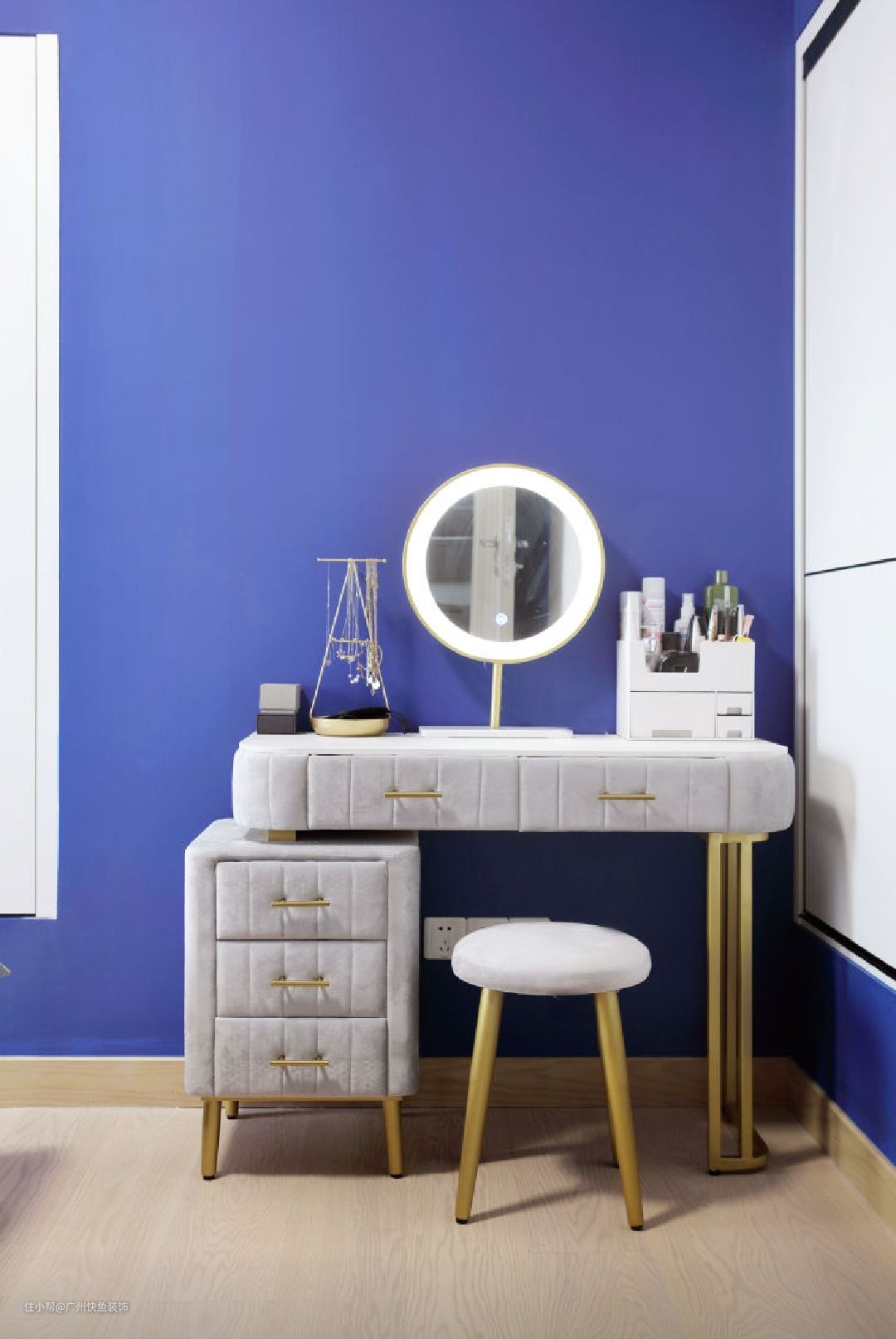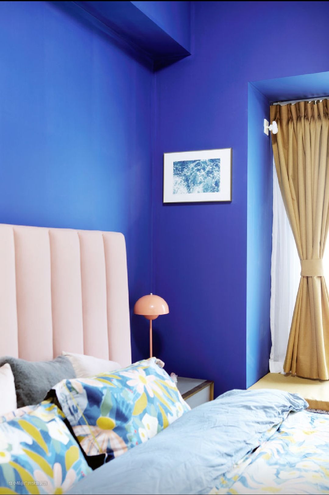 主卧墙体四面涂刷爵士蓝乳胶漆(色号:Dulux 30BB 10/337),搭配正白色衣柜及脏粉色床头靠背,梦幻十足。在墙角一侧设置插座,并在此放置梳妆台。