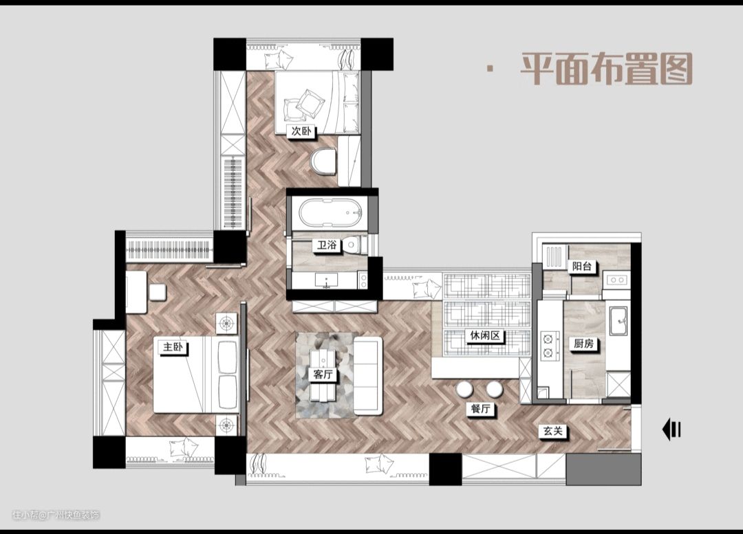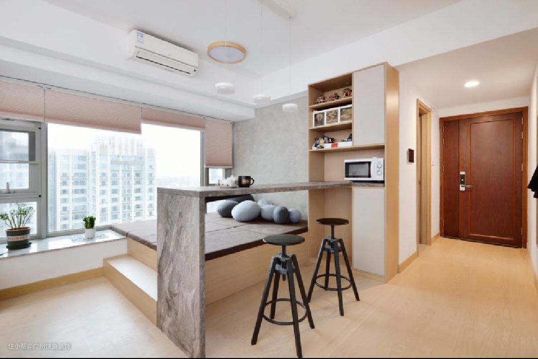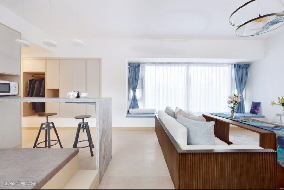 主要改造点: 1、分区域将不同风格加以融入; 2、在靠北飘窗一侧设立地台,作为休闲区; 3、于主卧和次卧分别设置梳妆台和升降书桌; 4、于餐厅吧台侧面设置餐边柜; 5、将4处比较鸡肋的飘窗做成嵌入式的玄关柜、衣柜。