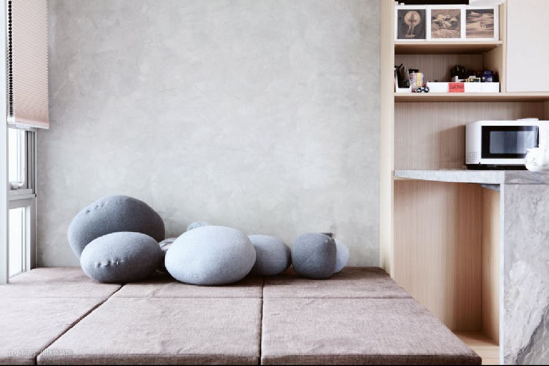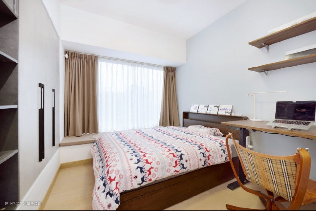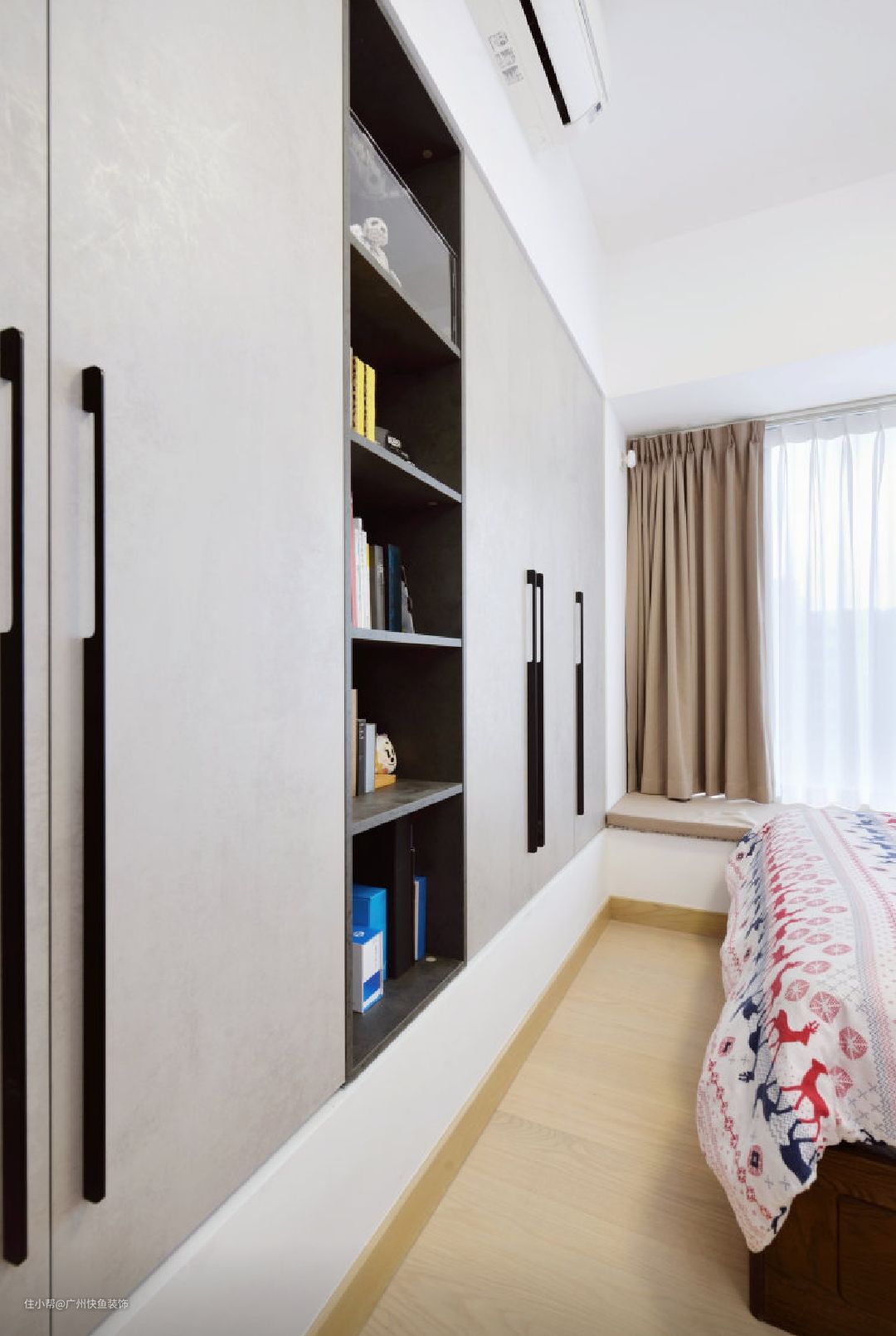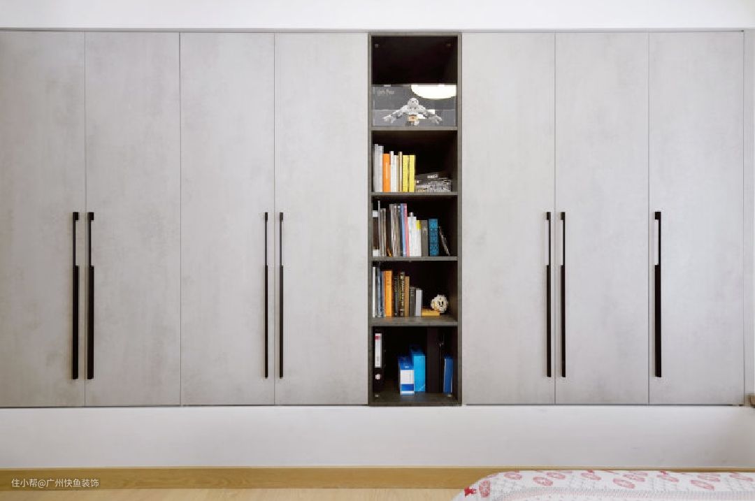 床尾飘窗原始长度为3800mm,深度也为600mm,同主卧做相同的封闭处理,并定制整面衣柜。柜门采用水泥饰面板,黑色极简拉手,颜值更高。中部设置开放式隔口,放置常看书籍和展示手办。