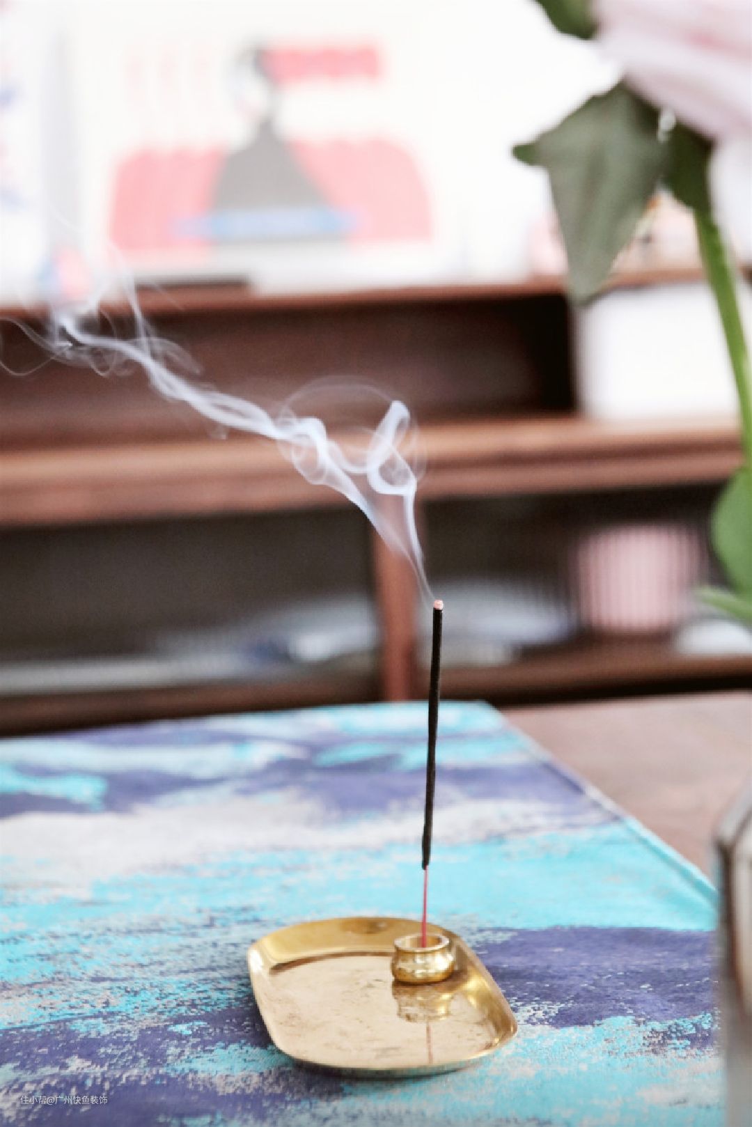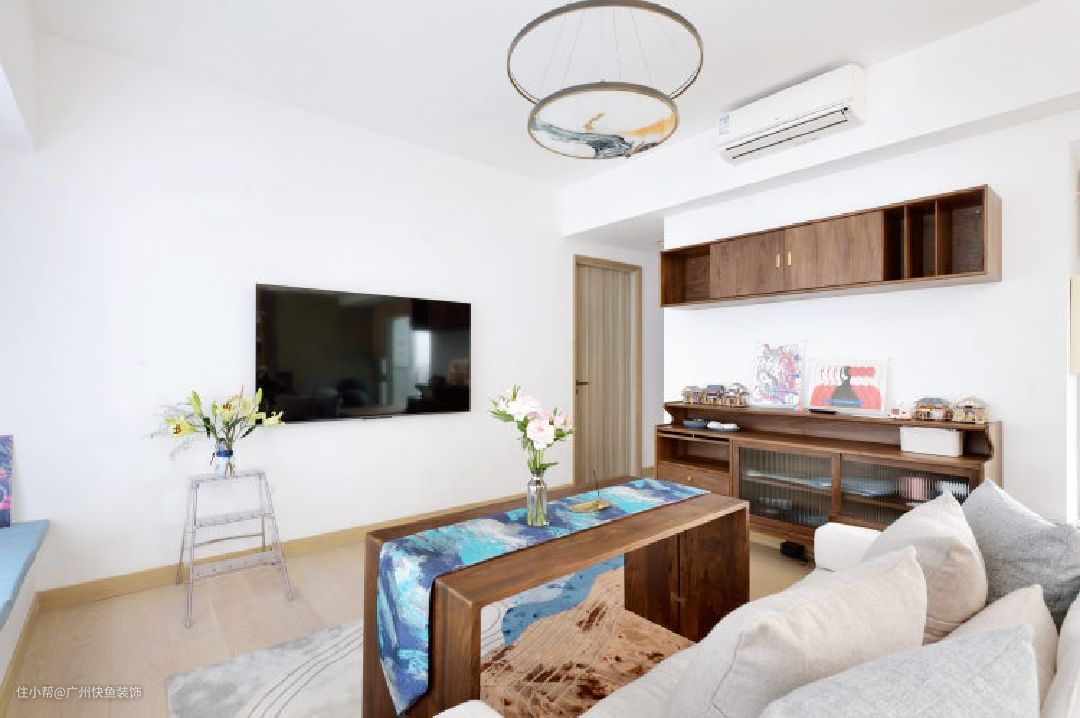 客厅以新中式风格为主线,选用简约造型黑胡桃木沙发、茶几、边柜+吊柜,并搭配珐琅彩琉璃灯、长条茶桌桌旗和金色檀香盘,营造出新中式的韵味。 原始层高为2800mm,最大化的加持空间通透感,选择不做吊顶。