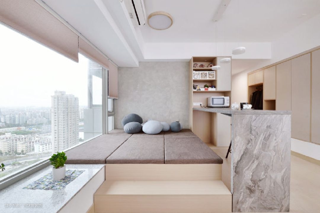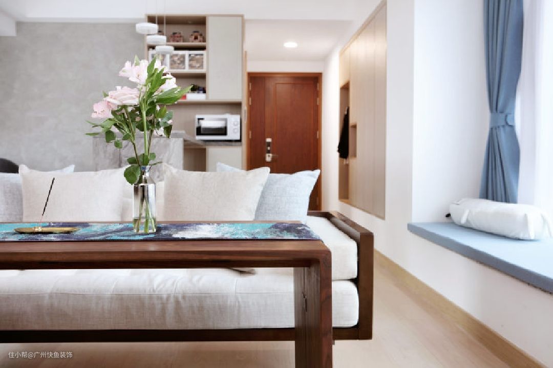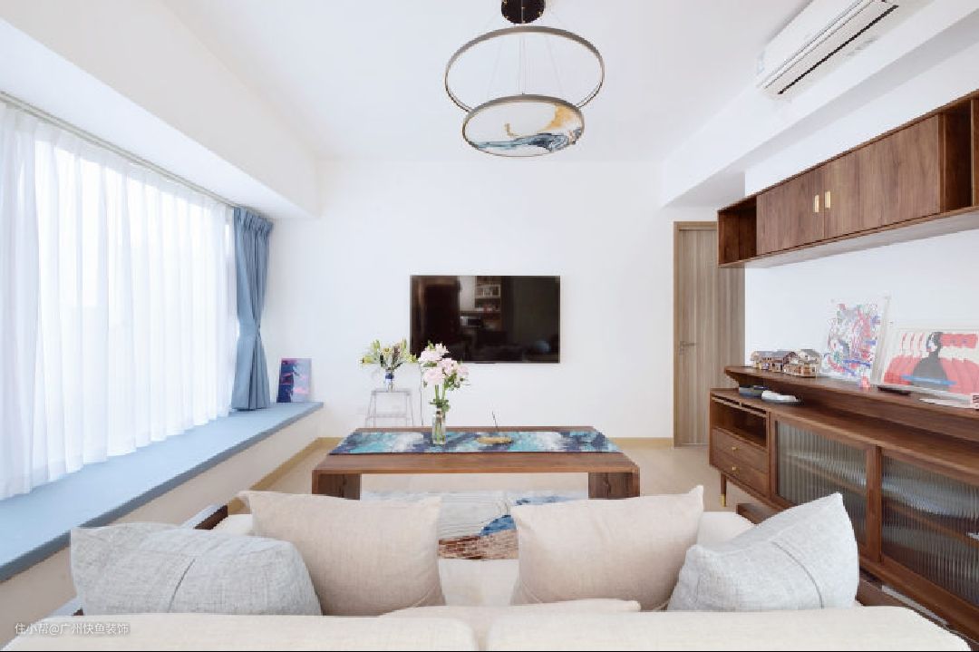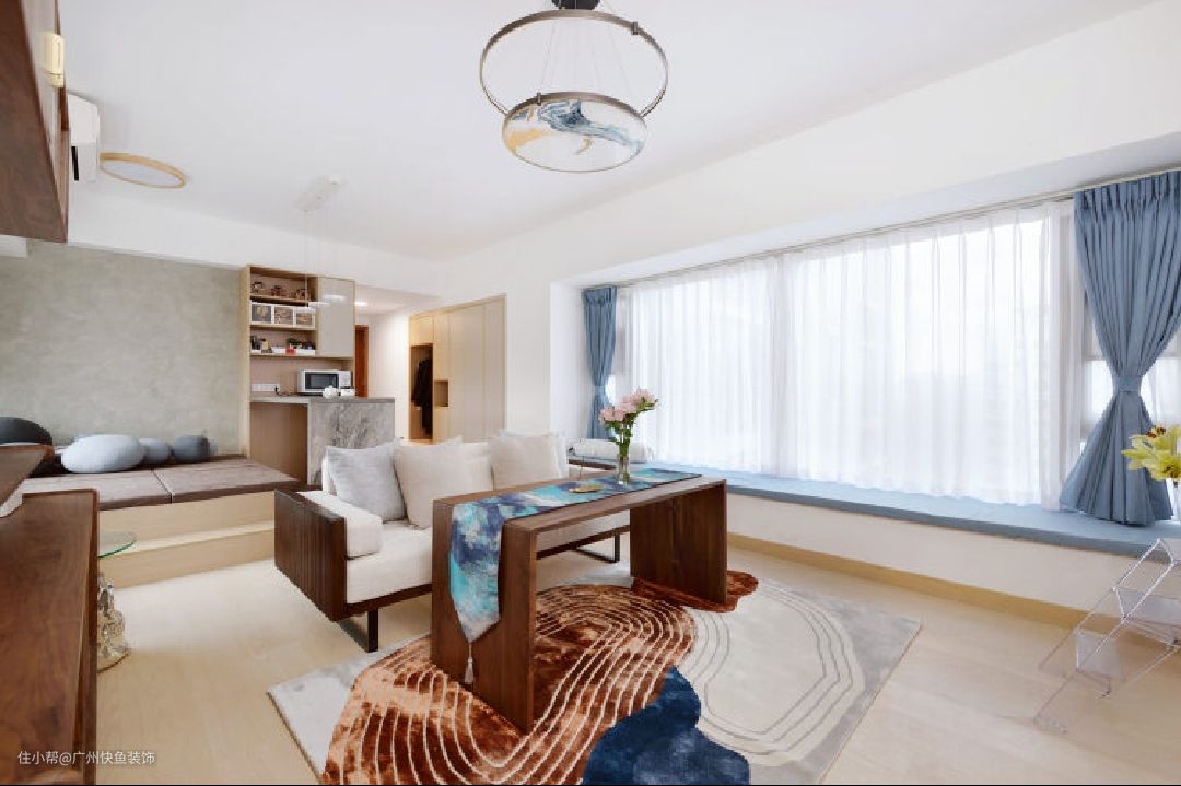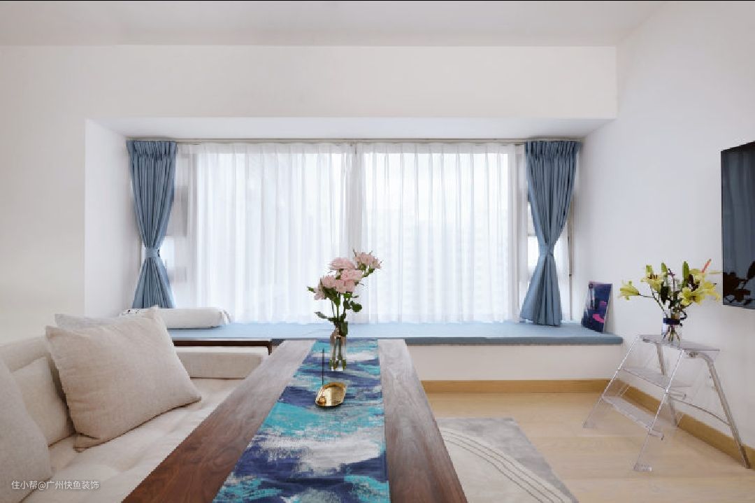 客厅最大的亮点就是长度达到4300mm的飘窗了,采光和视野极佳!直接按照窗帘色定制一体飘窗垫,能坐能躺,也是个看书、休闲的好地方。