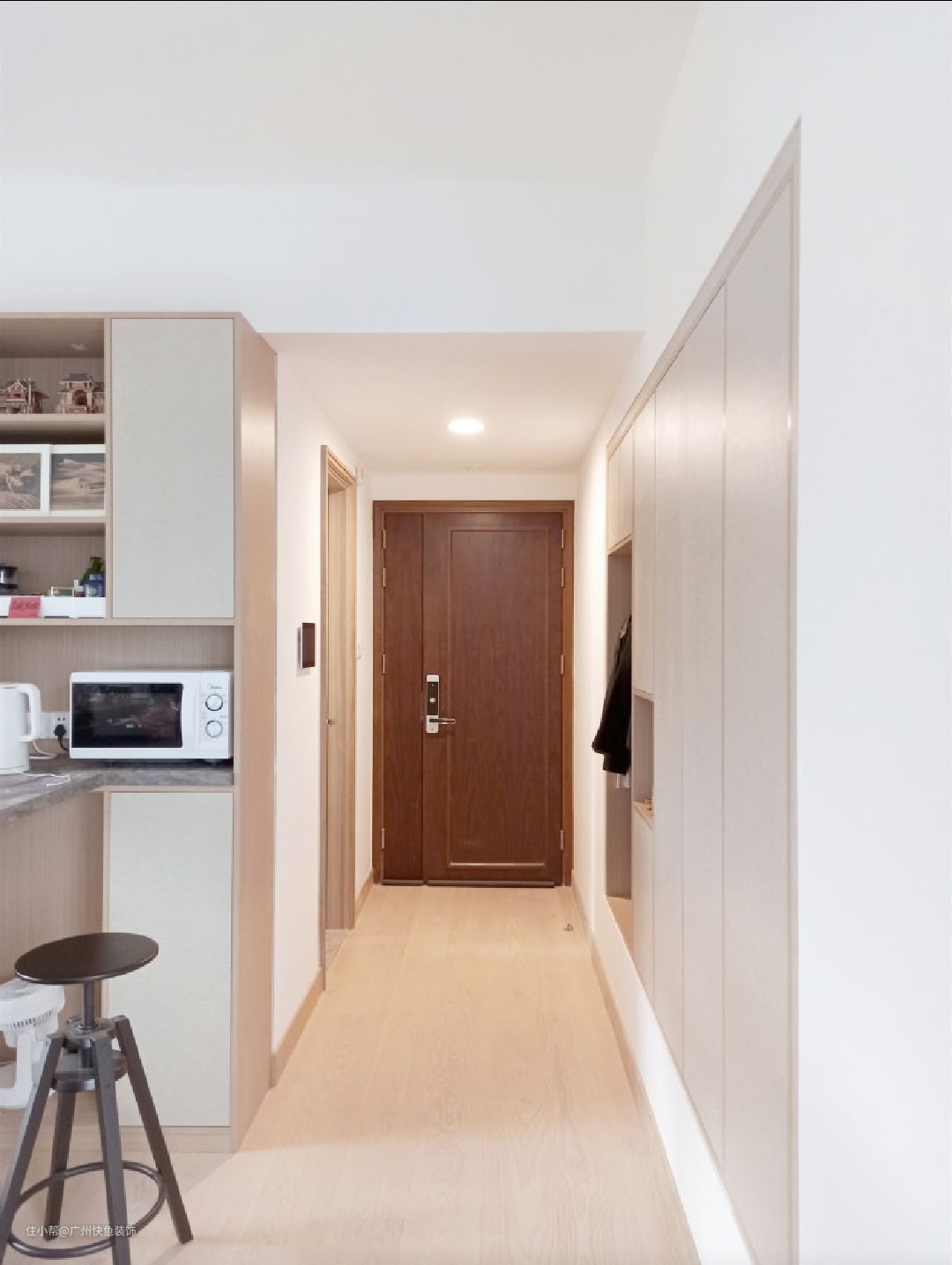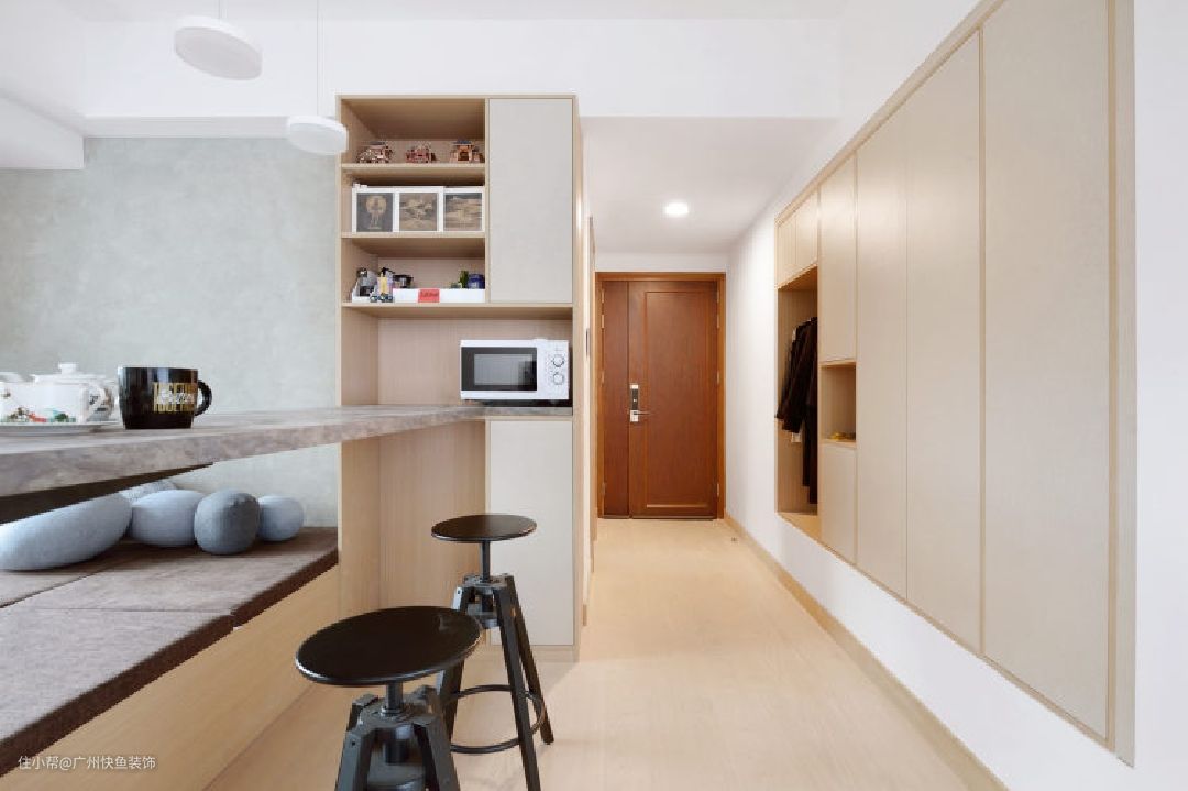 玄关走道实际宽度仅有1160mm,无法满足定制鞋柜的空间。走道一侧飘窗长度2450mm,深度650mm,采光极差且无法开窗换气,非常适合作为玄关柜使用。 原始飘窗台离地高度400mm,镂空一块区域,作为换鞋凳和挂衣区。与普通玄关柜不同,这个柜子净深度有600mm,除了可以收纳鞋子外,也可以存储大件的行李箱和衣物等。