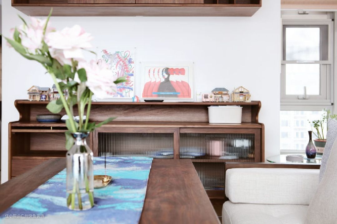 餐厅区域位于客厅沙发后,并靠近厨房位置,动线更加合理。同时为了满足咖啡和红酒的储存需求,选择定制餐边柜,并与吧台结合。