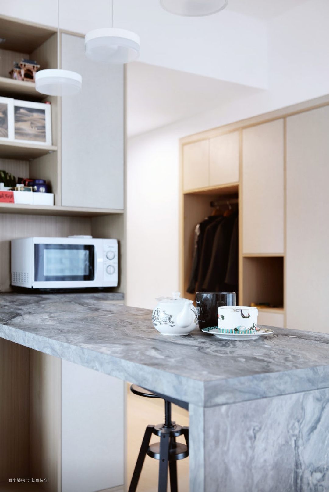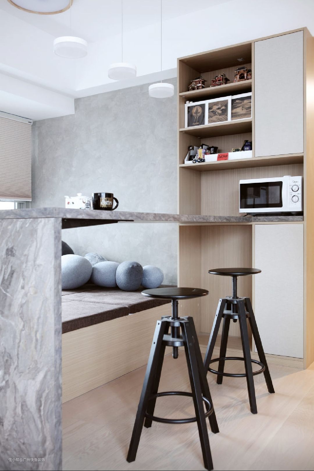 吧台材质选用仿伊朗灰石材纹理的实木颗粒板制作而成,以假乱真。板材厚度为40mm,保证吧台的承载力,并且不易变形。